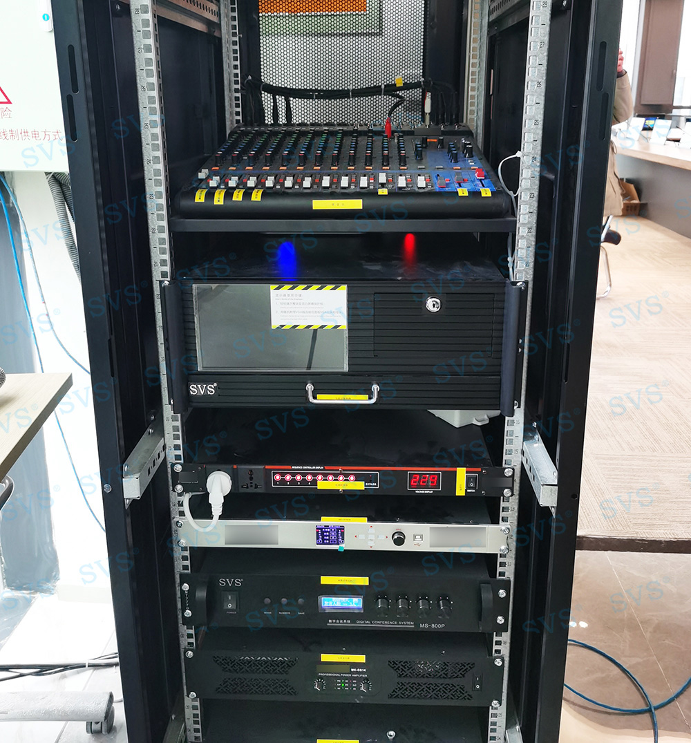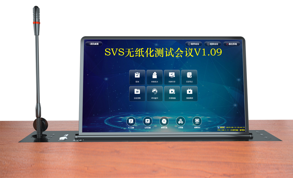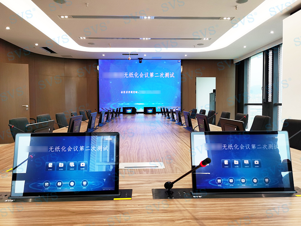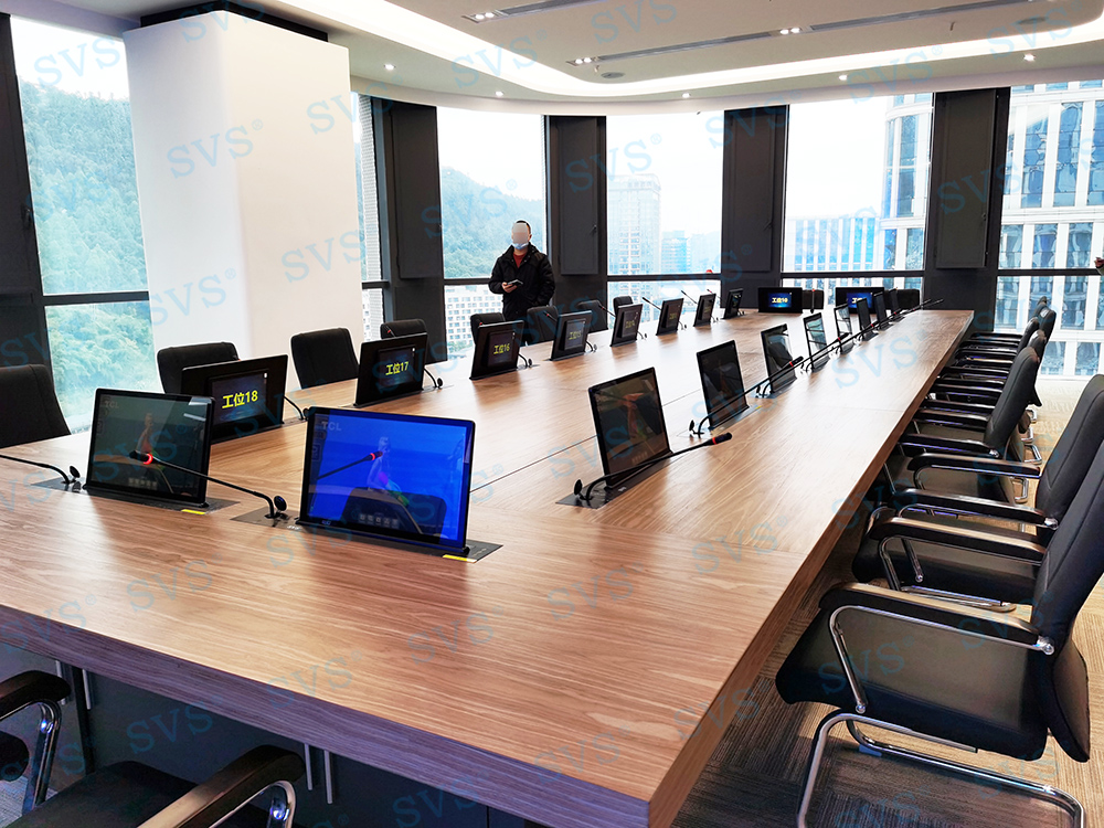 ,此次SVS为某集团打造无纸化会议室,会场共设20个席位,为每个席位配置了带话筒液晶屏升降器SV-LCD17(A1/B1),搭配无纸化软件的使用,轻松实现普通会议、无纸化会议、多媒体会议等多种会议模式的切换。再配合专业无纸化服务器SV-MP200B,此款服务器核心程序采用无人值守模式,开机后台自动运行;支持应用服务、消息服务和媒体服务监控功能;支持系统管理功能、人员管理功能、建立会议界面、会议资料管理功能、会议投票等功能。整体效果获得现场一致好评。