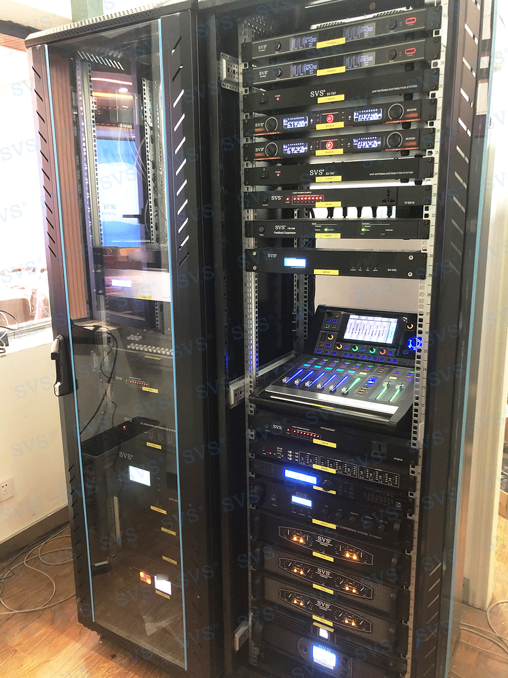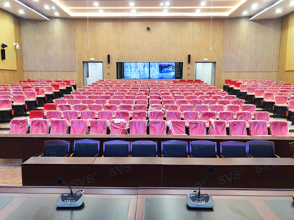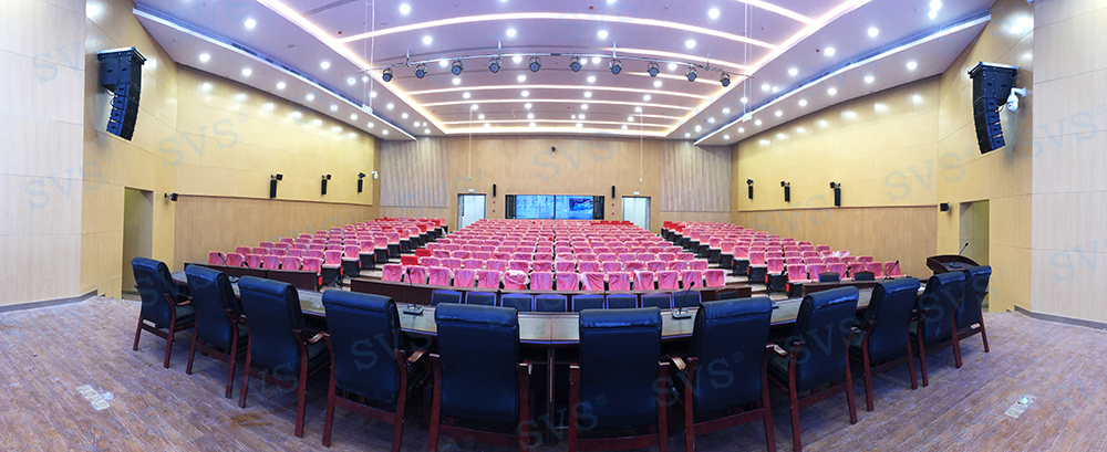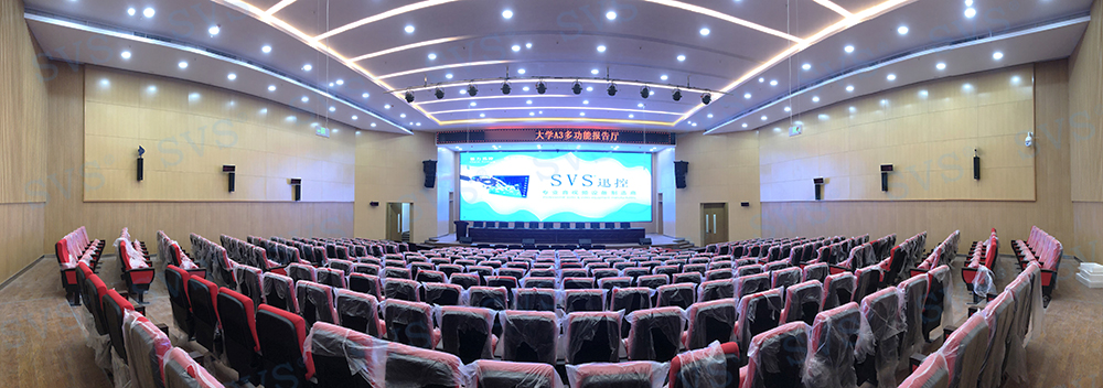,此次SVS为某大学打造大型阶梯多功能厅,会场可作多种用途使用,可容纳约320人进行会议。因客户希望打造出高品质的会议效果,迅控为客户配置了台面可移动式时钟会议系统发言单元以及专业扩声系统。其中L系列线阵音箱在主轴垂直平面指向性呈窄波束,能量叠加可以远距离辐射。弯曲的线性音箱组装可以让下端覆盖近区,中上端覆盖中区及远区,形成自近而远的等声压覆盖。解决了传统的音箱墙导致的声音干涉,浑浊,声压远近不均匀的难题。搭配数字调音台D2018,采用七寸OLED双向可触摸操作屏,即时可见,强大的输入输出接口,满足各类场景的使用;时尚科技感外观、人体工程学设计,满足最佳操作视角;多功能切换LED指示灯条,软、硬件联动电动推子等,具备高端调音台的一切配置。会场通过会议系统、扩声系统、信号处理系统的相互结合,轻松提高会议效率,打造出一个具有先进性和实用性的多功能厅。