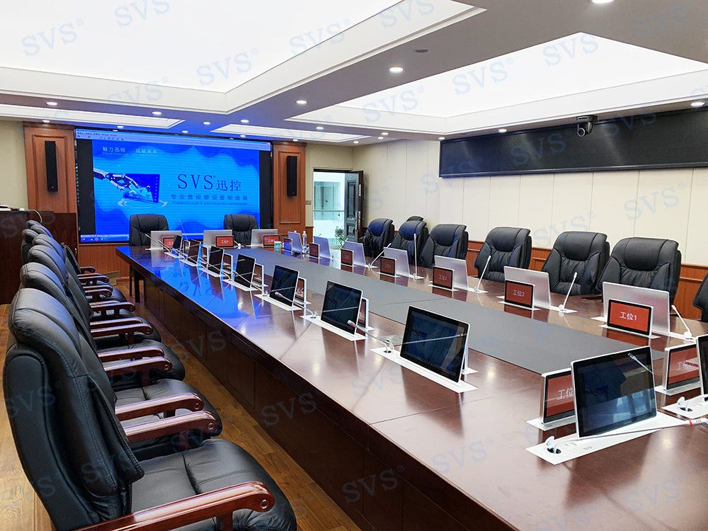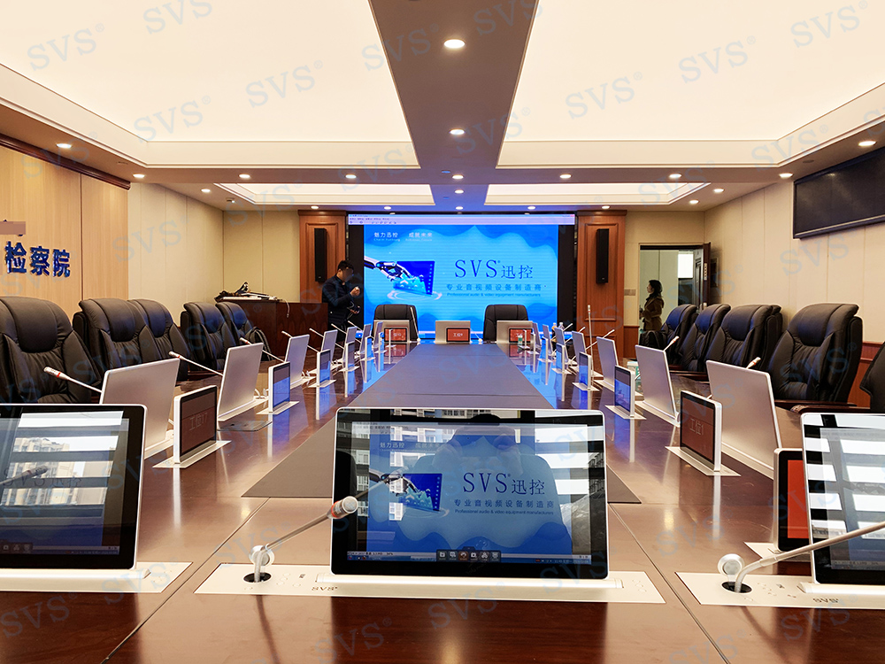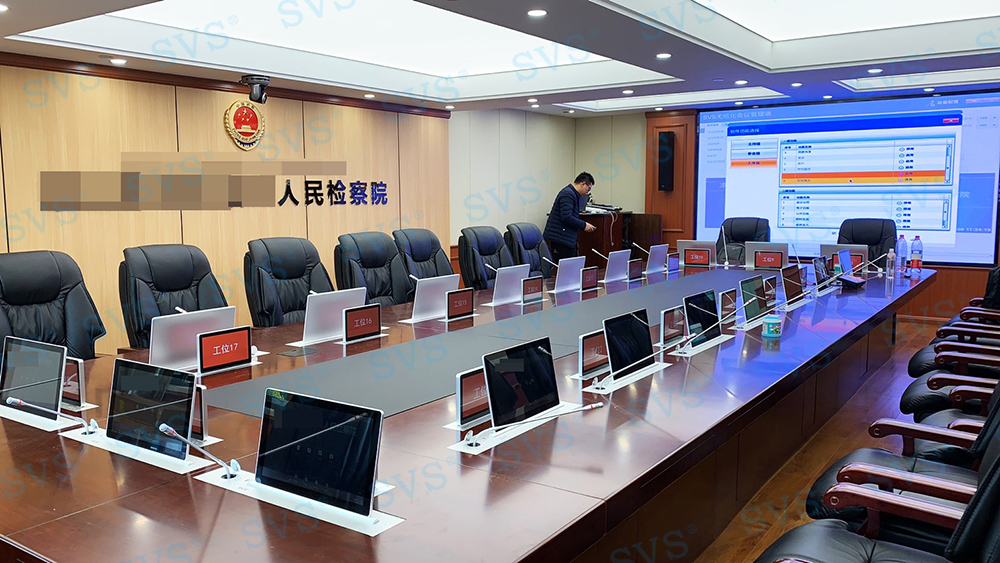,此次SVS为某人民检察院打造高端无纸化会议室,会场共设20个席位,为客户特别定制银色款液晶屏升降器SV-LCD17(TS)、银色款升降桌牌。升降桌牌采用电子墨水屏技术,除了出色的双面显示效果,还拥有超低能耗,可长时间使用无需充电更换电池。科技感十足,配合SVS无纸化会议系统,轻松实现普通会议、无纸化会议、多媒体会议等多种会议模式的切换,轻松提高会议效率。