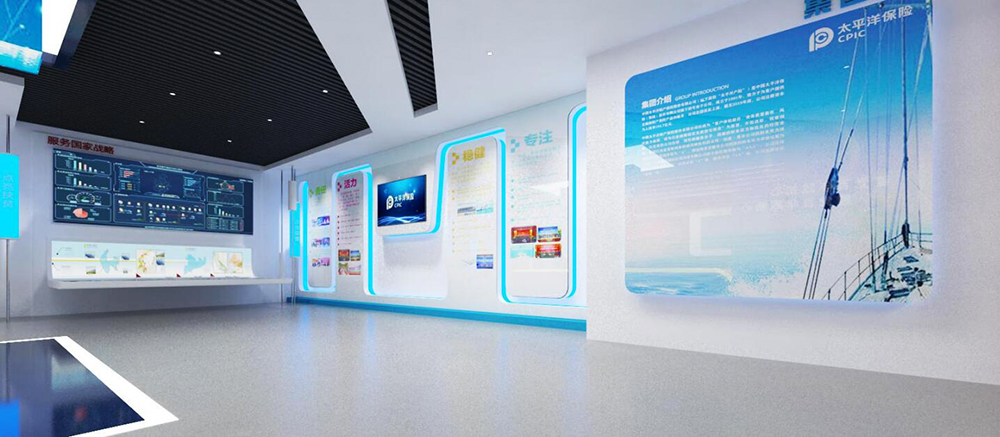 展厅沙盘区域采用了2*2拼接屏、75寸一体机作为显示,搭配控制系统与扩声系统,呈现出太保多数据纬度,通过一体机触点智能交互控制,在拼接屏上呈现不同的数据纬度。
