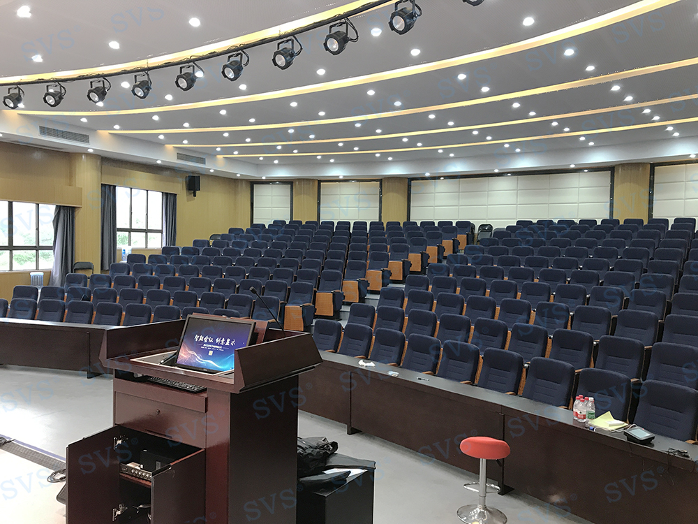 此次SVS为某大学打造阶梯多功能厅。会场可容纳近300人进行会议,并可根据现场使用情况,灵活调整为表演模式,会议模式,新闻模式等多种会议模式,多变的使用方式通过简单的控制面板即可轻松实现,校方领导给与迅控高度认可。