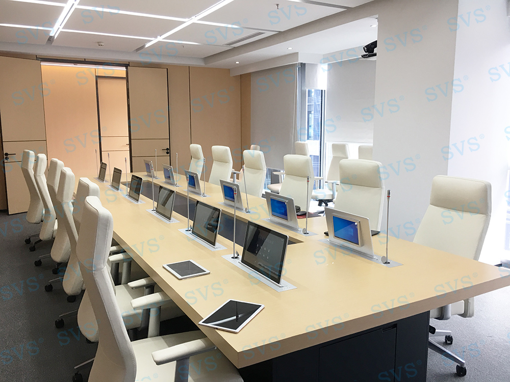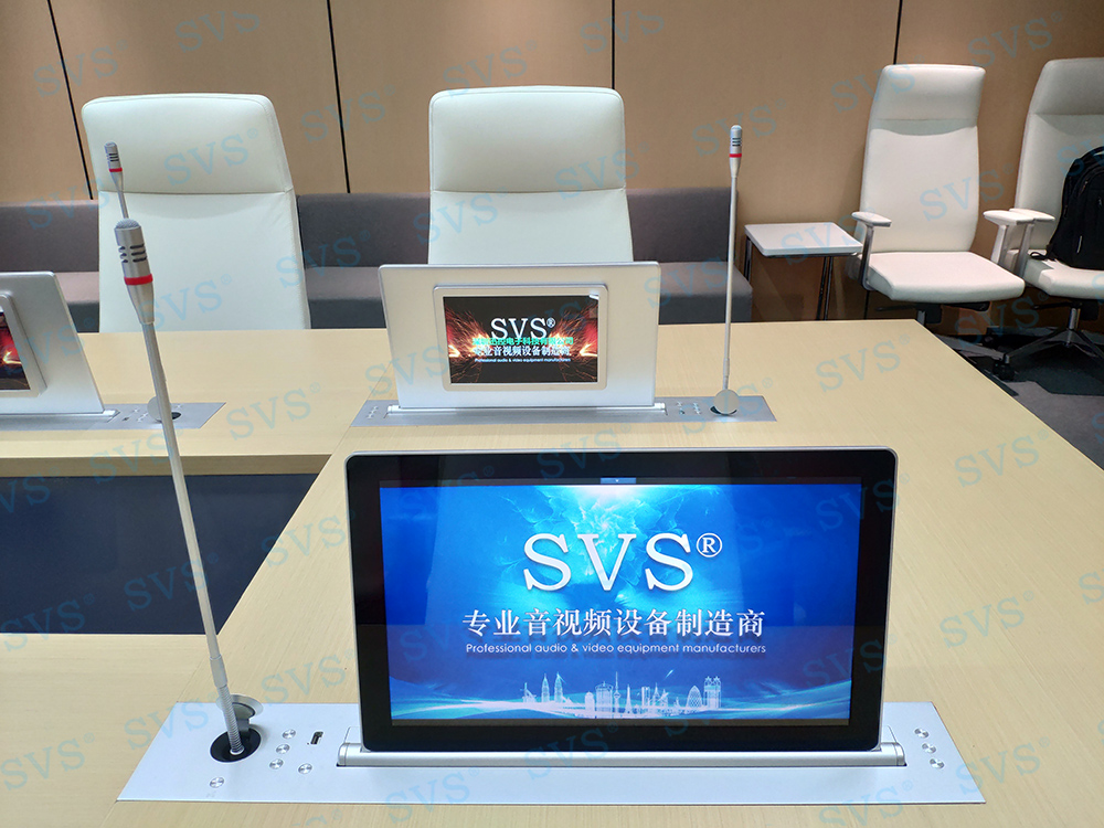 此次SVS为某集团打造无纸化会议室,会场共设置12个席位,为每个席位都配置了银色定制版带话筒液晶屏升降器SV-LCD17(A1/B1),科技感十足,提高办公效率,配合无纸化软件的使用,轻松实现普通会议、无纸化会议、多媒体会议等多种会议模式的切换。