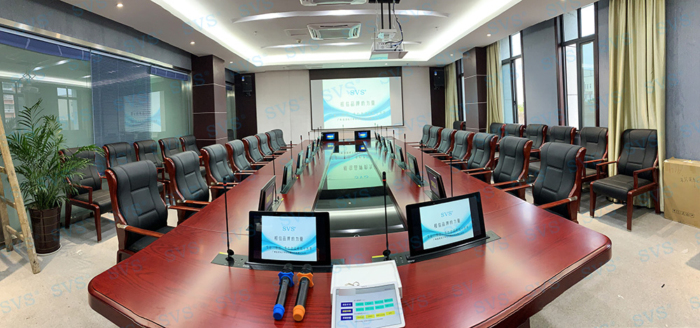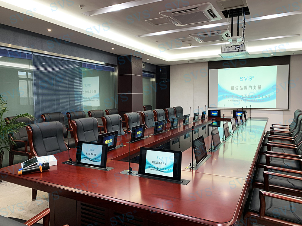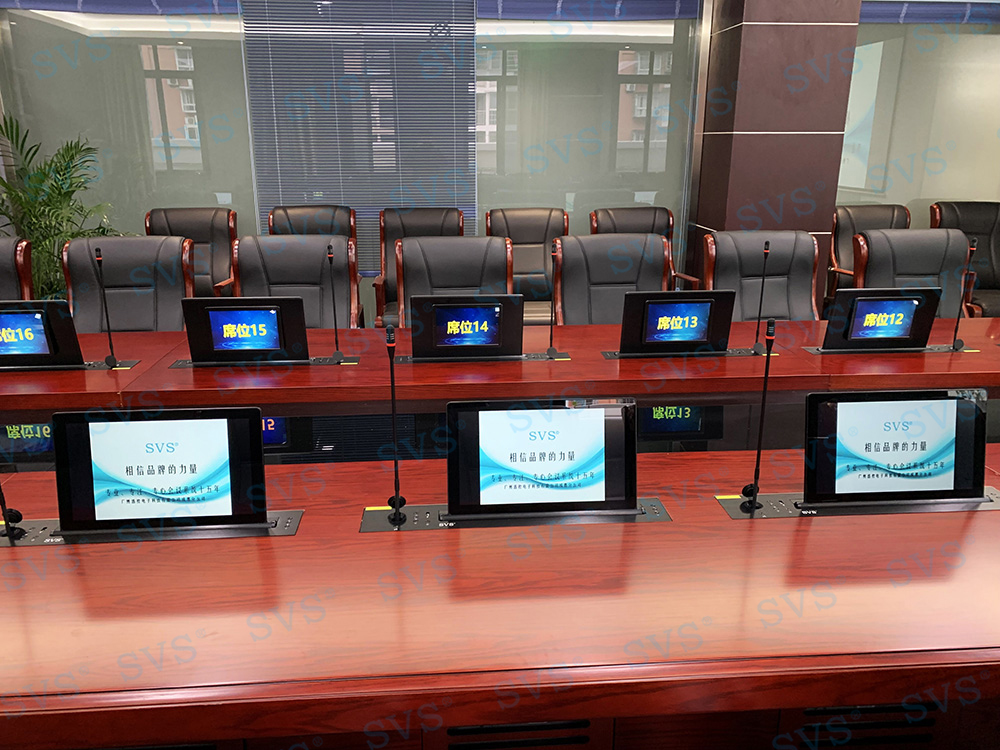 此次SVS为农商银行某支行打造无纸化会议室(双屏升降器+无纸化系统),会场共设18个席位。为客户推荐使用带话筒双屏升降器SV-LCD17(A1/B1),搭配上SVS无纸化会议系统,轻松实现普通会议、无纸化会议、多媒体会议等多种会议模式的切换。整体效果获得现场一致好评。