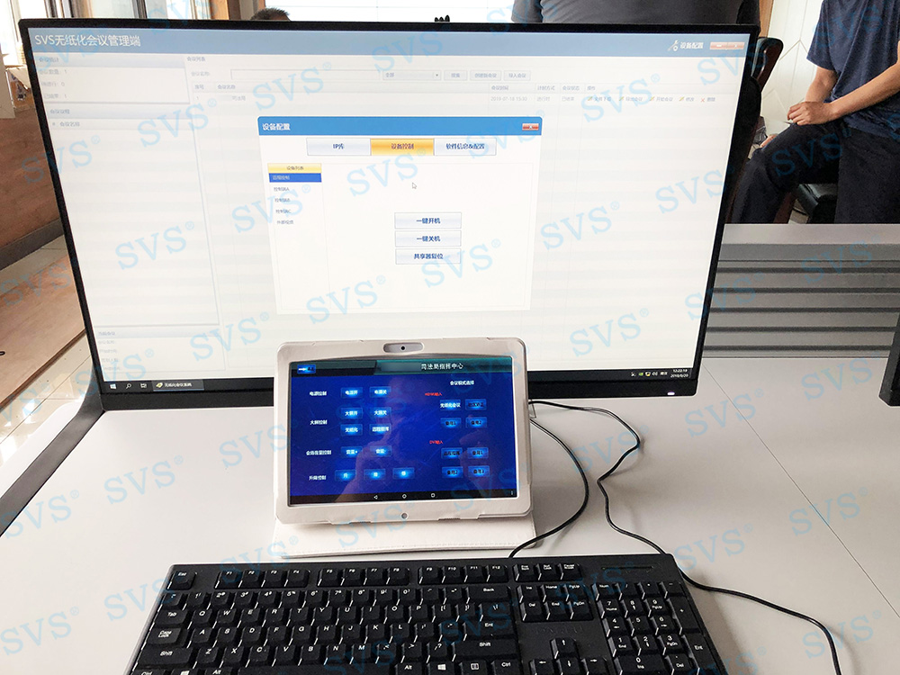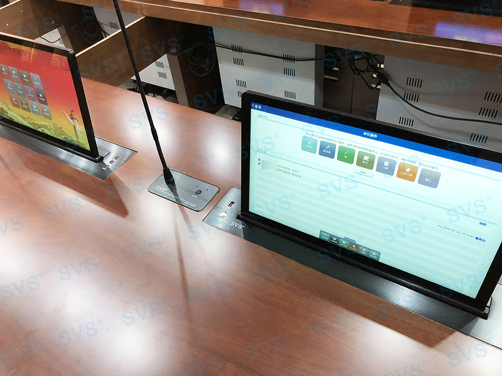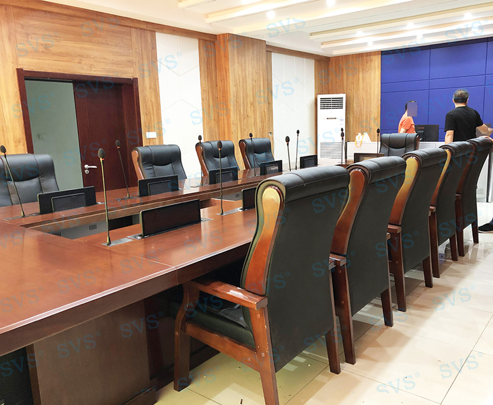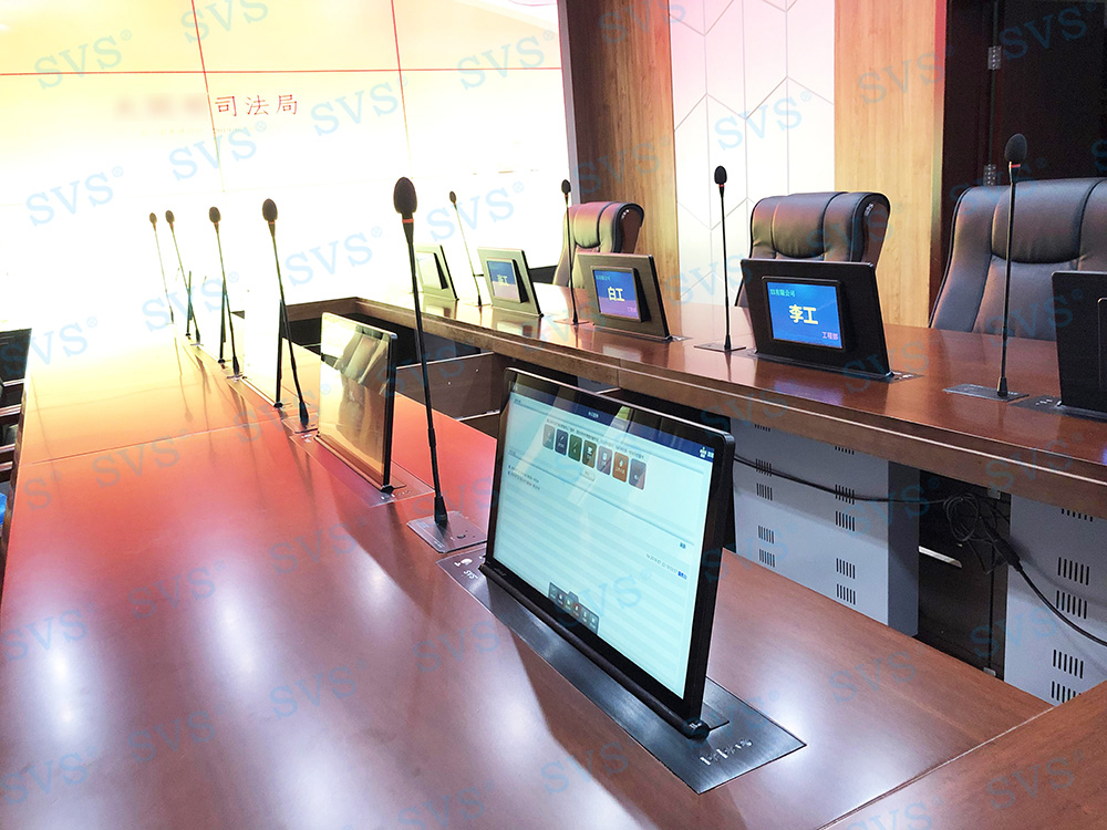 ,此次SVS为某司法局打造指挥中心,中心应用SVS无纸化会议系统。SVS无纸化会议系统运行于千兆网络环境,该系统提供了强大的会议管理功能,包括多会议信息的制定发布及会议议程提醒,会议签到、投票,会议资料共享和批注,会议同屏,会议笔记及会议服务功能,为与会人员提供一个多功能、全方位、保密性的无纸化会议平台。并为客户推荐使用双屏升降器SV-LCD17TD,轻松实现普通会议、无纸化会议、多媒体会议等多种会议模式的切换。发言系统使用MS-90A/B,采用进口可绕式鹅颈咪杆,柔软耐用;内置进口高保真、远距离拾音咪芯和防手机干扰电路,保证发言效果。整体效果获得现场一致好评。