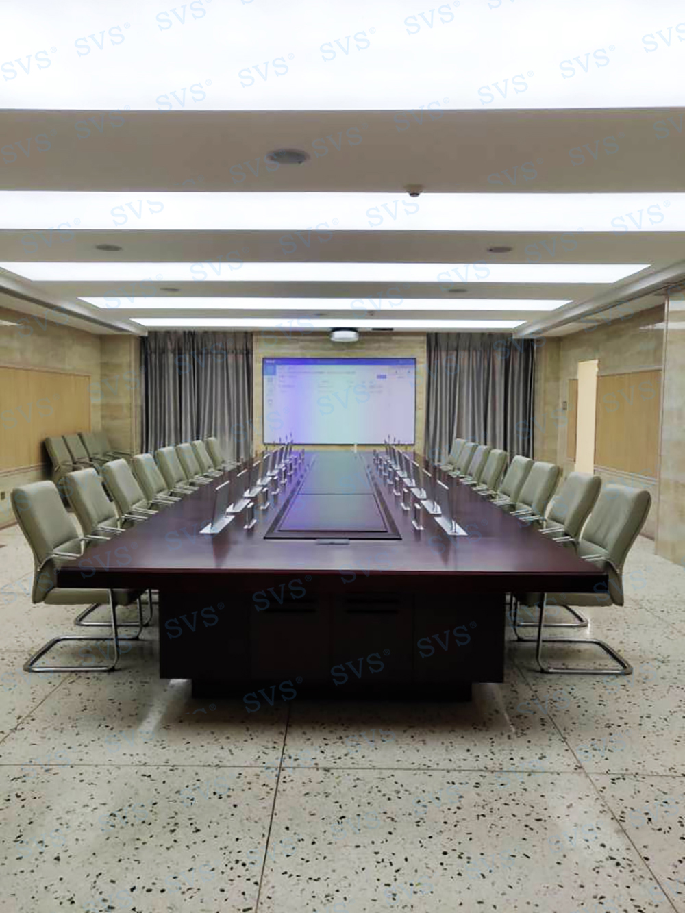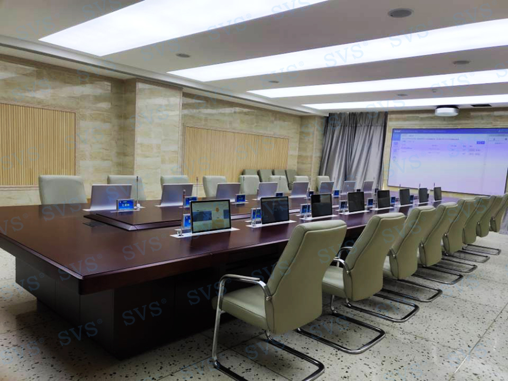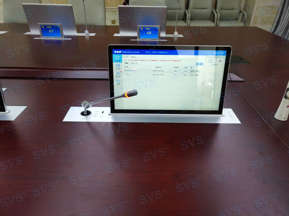 SVS此次为某空气动力研究所打造无纸化会议中心,会场共设置16个席位,为每个席位都配置了银色定制版带话筒液晶屏升降器SV-LCD17(A1/B1),配合无纸化软件的使用,轻松实现普通会议、无纸化会议、多媒体会议等多种会议模式的切换。