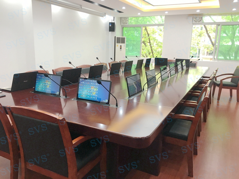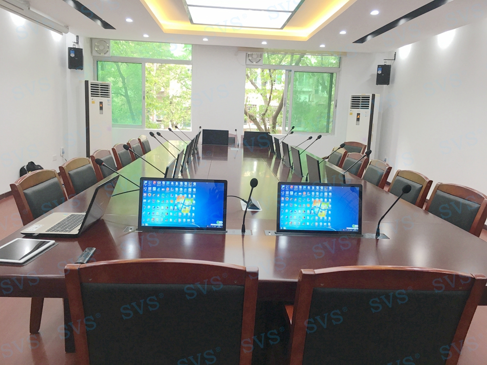 SVS此次为某电力建设公司打造一个无纸化会议室,会场一共设16个坐席,设置了16个桌面显示器隐藏+发言系统,方便每个席位第一时间参与会议内容和操作,并根据现场环境,布置了专业会议音箱,打造出专属会议声场,得到相关领导的一致认可。