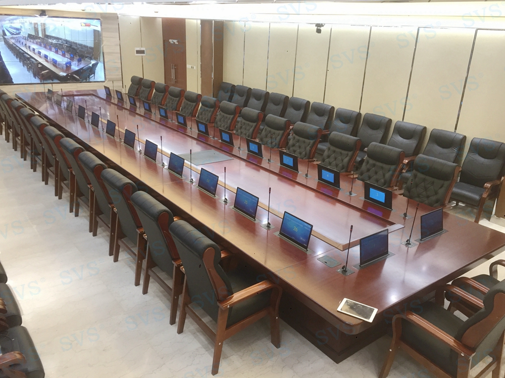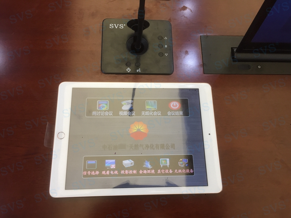 ,此次迅控为中石油某分公司打造一个无纸化会议室,会场选用最新超薄双面屏一体升降器,主副双面屏显示,主屏采用10点触摸电容屏,超薄一体式设计,副屏具备桌牌显示功能。整机大部分采用铝合金材料,结合一次性模具成型的金属外壳,美观精致。产品动力采用直角叠加式齿轮与齿条啮合传递,直线轴承导向,完成垂直爬树式精准运动,外加自动开合门连杆结构,简单可靠,精度高,使开合动作完成后的运动面与固定台面始终保持平整。该产品是新时代无纸化会议或者视频会议室的主流产品,配合无纸化软件,可以实现众多会议功能,是与会人员之间信息化交互的重要工具。