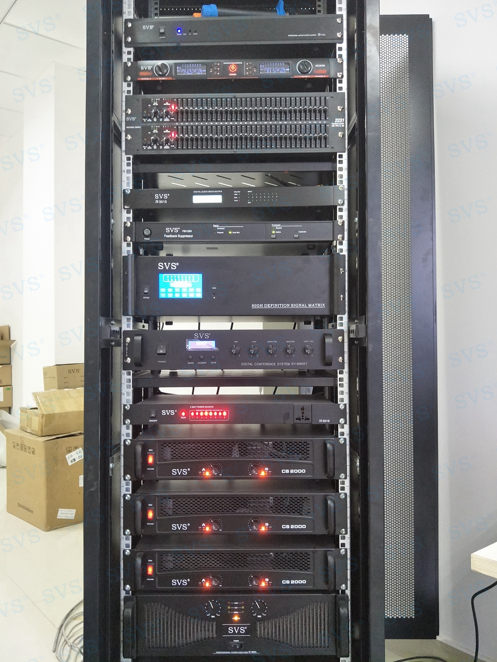SVS为某医院打造一个多功能厅,会场前后都设置了播放设备,并为会场打造出专属的表演级音箱产品。