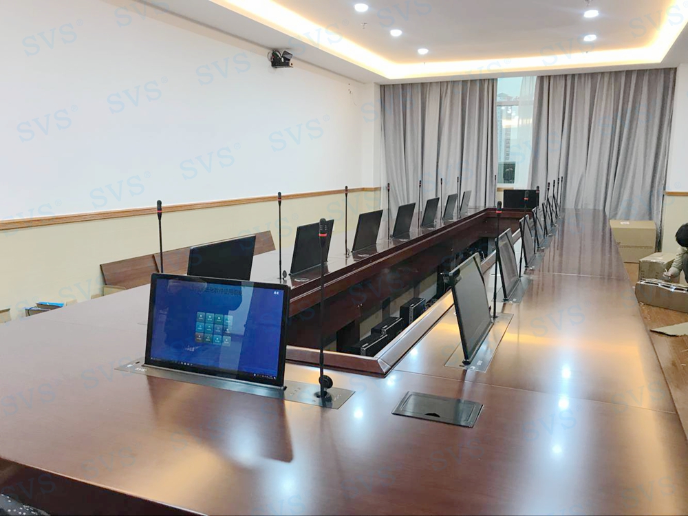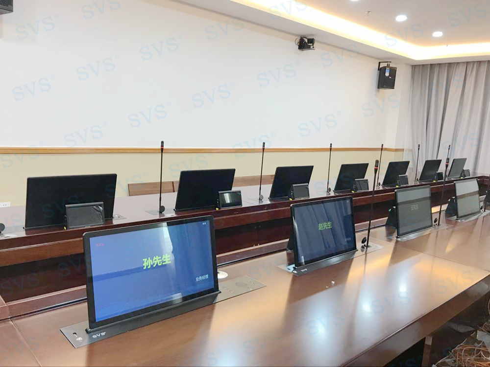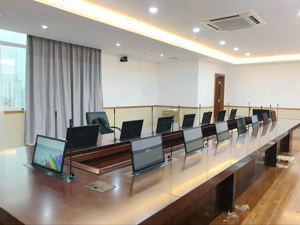 此次SVS为人民银行某分行打造一个无纸化会议室,使用带话筒升降的液晶屏升降一体机,发言系统和显示系统轻松解决,再配合上SVS无纸化会议系统,轻松打造绿色环保、高效便捷的现代化无纸化会议空间。