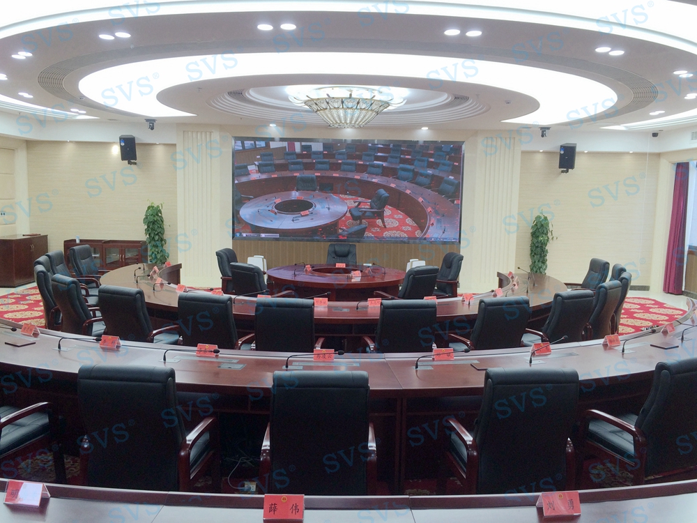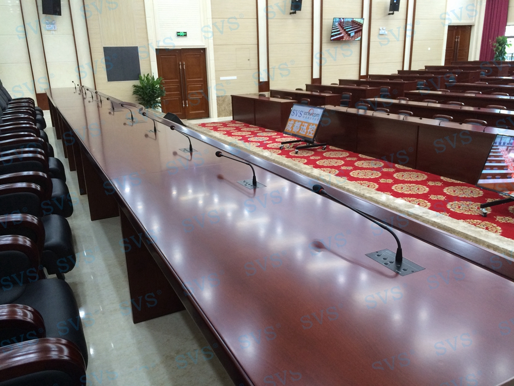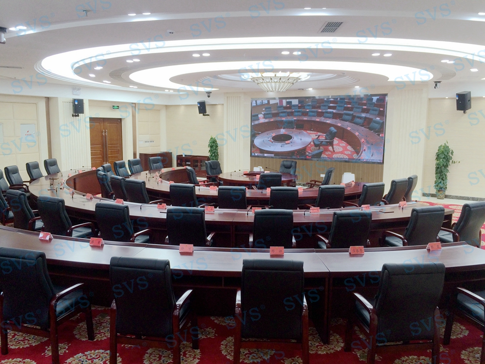 三、中型会议室:会场可容纳40人进行会议,为主席台设置了时钟发言会议系统,会场设置2组主扩声,并配置会议跟踪系统。