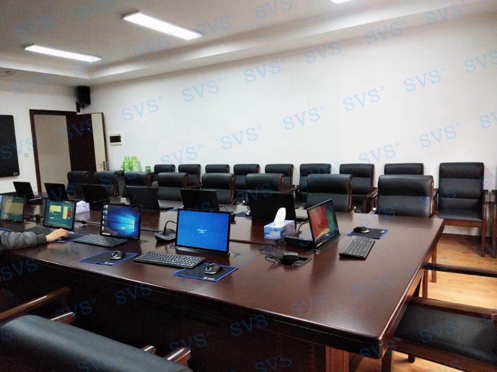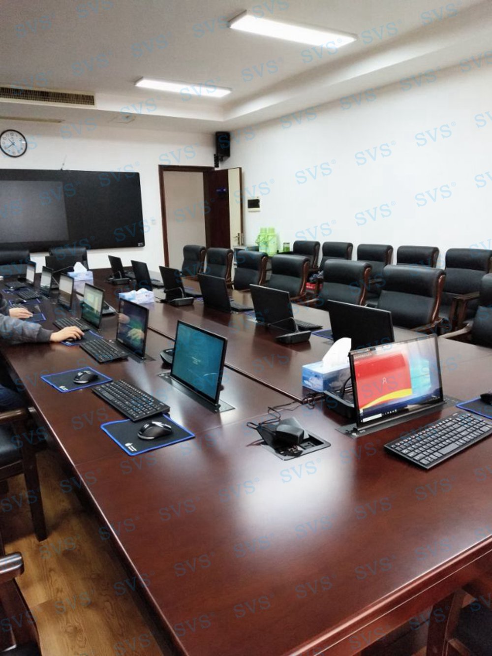 ,此次SVS为某中医学院打造一个无纸化会议中心,会场共设有15个席位,为每一个席位安装了超薄液晶屏升降器 SV-LCD17(点击了解更多):该产品为超薄液晶屏升降器,采用结构与屏体一体式设计,整机大部分采用铝合金材料,结合一次性模具成型的金属外壳,美观精致。产品动力采用直角叠加式齿轮与齿条啮合传递,直线轴承导向,完成垂直爬树式精准运动,外加自动开合门连杆结构,简单可靠,精度高,使开合动作完成后的运动面与固定台面始终保持平整。产品标配内嵌式17.3英寸全高清16:9液晶显示屏。 选配触摸板,支持10点触摸,即插即用。该产品是新时代无纸化会议或者视频会议室的主流产品,配合无纸化软件,可以实现众多功能,是与会人员之间信息化交互的重要工具。