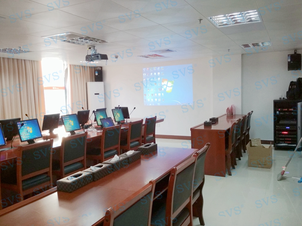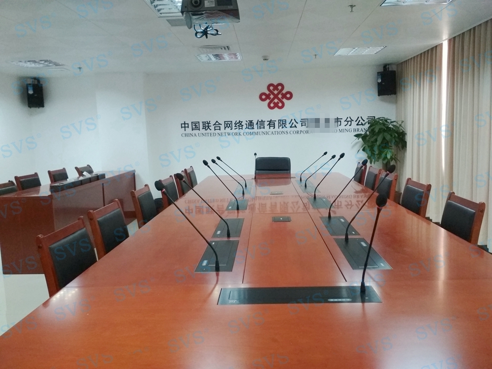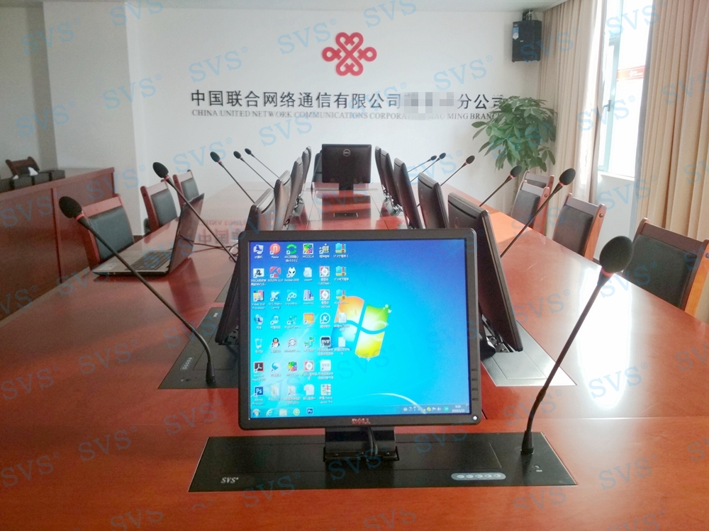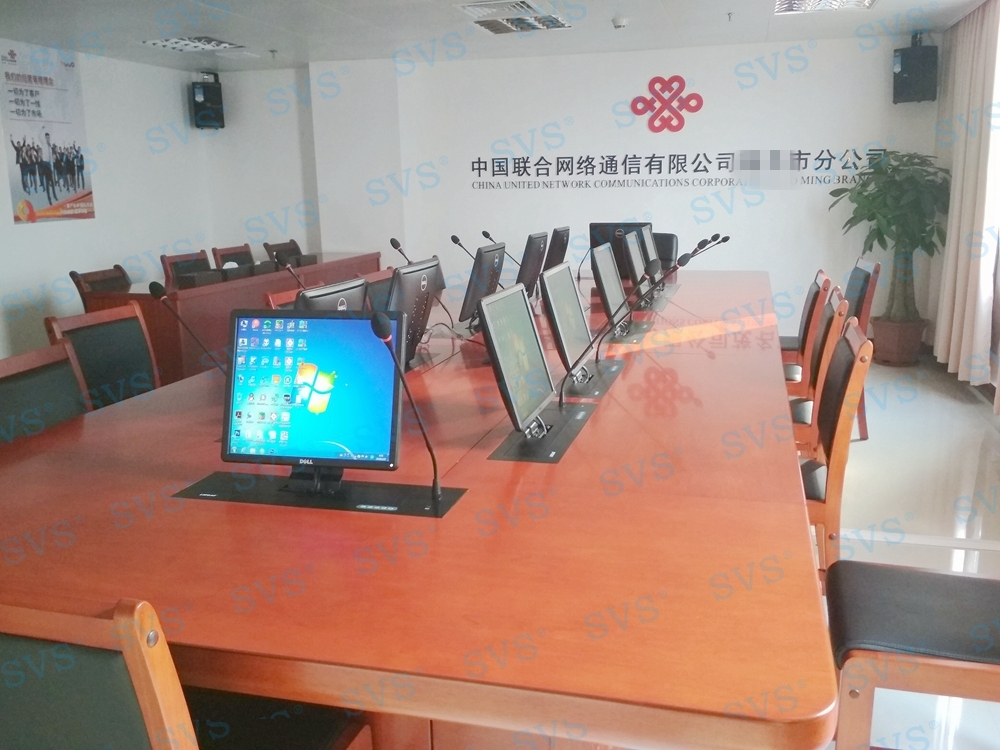 ,SVS此次为联通某市分公司打造一个无纸化会议室,会场选用 带液晶屏显示 带话筒液晶屏升降器SV-LCD17(TL)(点击了解更多详情) 该产品为超薄液晶屏与话筒升降一体机,采用结构与屏体、话筒一体式设计,整机大部分采用铝合金材料,结合一次性模具成型的金属外壳,美观精致。产品动力采用直角叠加式齿轮与齿条啮合传递和同步轮同步带传动,结合直线轴承导向,完成精准运动。产品标配内嵌式17.3英寸全高清16:9液晶显示屏, 选配触摸板,支持10点触摸,即插即用。产品还搭配高级会议系统单元,产品支持单机或者会议系统组网使用。