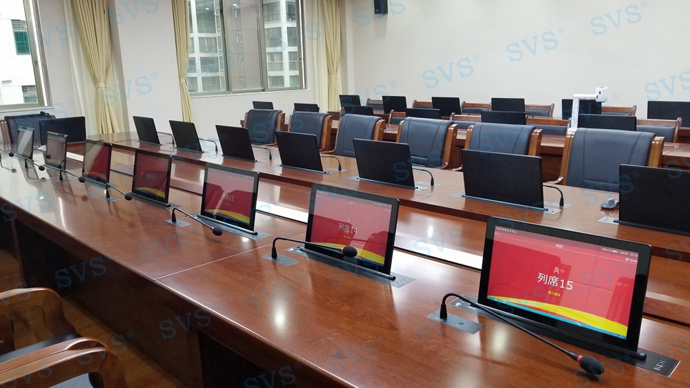 ,SVS此次为某市检察院打造全新无纸化会议厅,会场可以容纳32人进行会议,为每个席位都设置了桌面信息交互系统,并分为发布交互区和信息浏览区,两个区域根据使用用途不同,配置了不同的控制终端,发布交互区的人员可以对会议内容及时发布、更改、上传等操作,信息浏览区为会议参与者提供清晰的会议内容展示,便于记录及增加会议参与感;会场还设置了现场会议跟踪、远程视频会议等功能,为客户打造出一个集无纸化、远程视频、投票表决等综合会议模式为要一体的高级现代化会议厅,最终效果也得到了客户的高度评价。