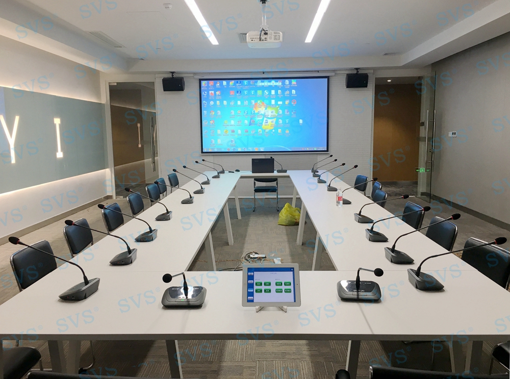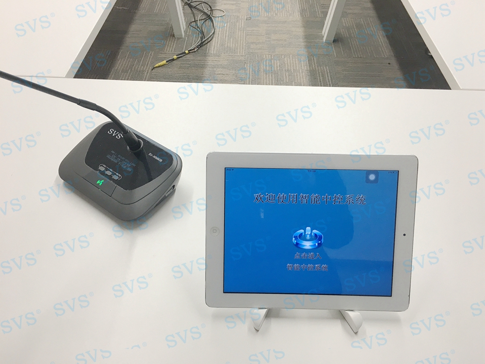 ,此次迅控SVS为客户打造一个视频会议中心,为了满足客户现有办公家具,并让会场具备更高的灵活性和科技性,此次迅控为客户选配 无线会议发言单元:SV-WM90A/B(点击了解更多),采用进口可绕式鹅颈咪杆,柔软耐用;内置进口高保真、远距离拾音咪芯和防手机干扰电路,保证发言效果;单元内置充电电路,可保证话筒电池缺电时的正常使用,外配充电箱,集中管理充电,灵活便利;内置液晶屏,可显示电量、欠压报警、频段信息、信号强弱、开关状态等信息,一目了然。配合控制系统后台的人机交互平台 D1100(点击了解更多):界面:个性化控制程序界面定制,支持全球各种语言显示;按键:3D/2D按键和多种显示效果;整体效果科技感、灵动性、高品质音效等都得到客户的一直好评。