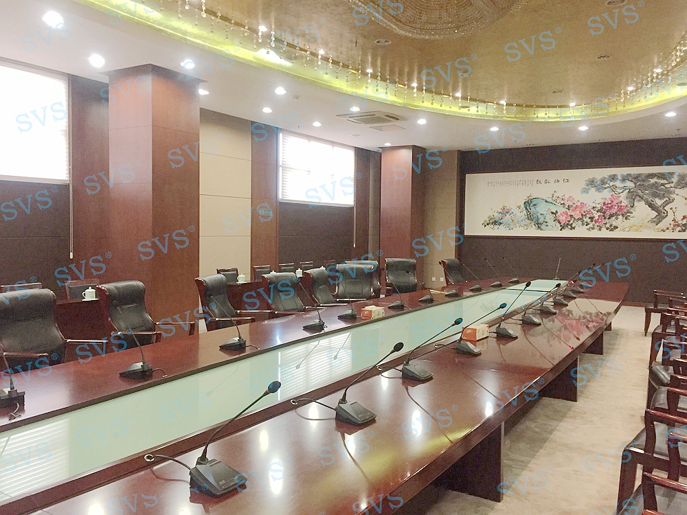 ,此次SVS数字会议系统为某政府数字会议厅服务,会场可同时容纳50人进行会议,配置22支会议发言单元为主席桌发言席使用,会场主要用于高层会议、培训会议、视频会议等。