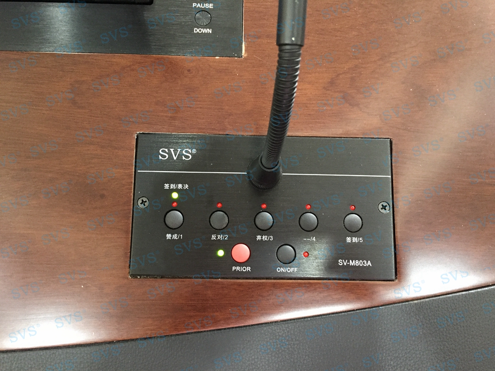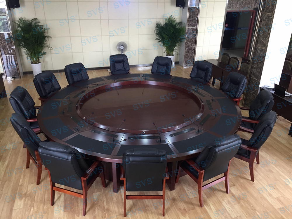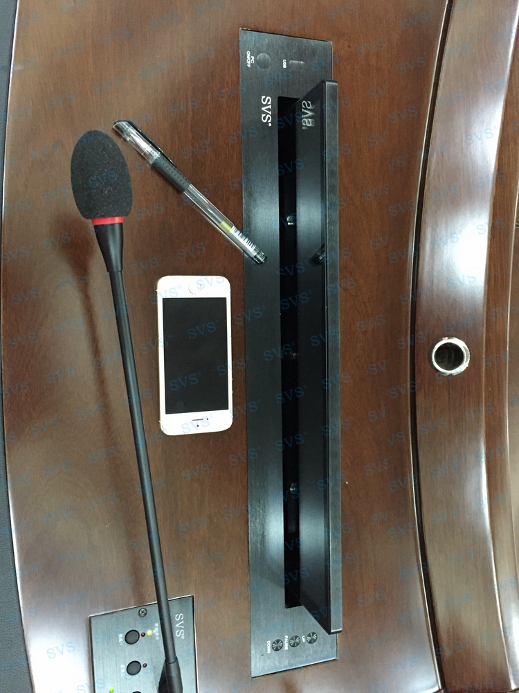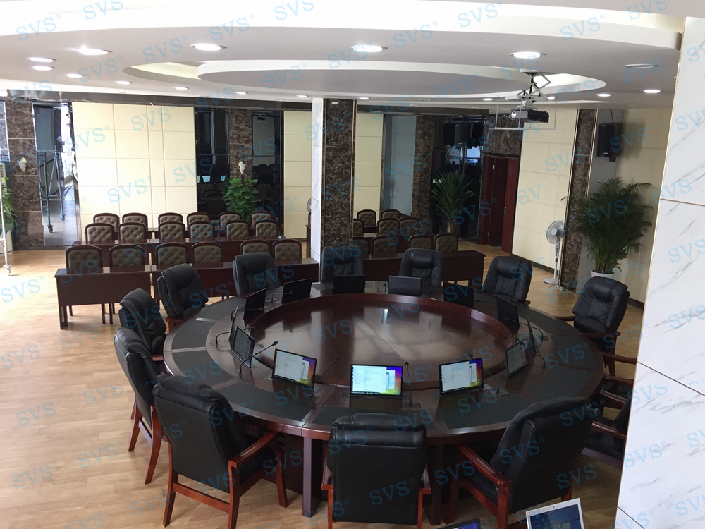 ,此次SVS为某四川省某住建局打造一个大型无纸化会议中心,使用超薄液晶屏升降器(点击了解更多详情),该产品为超薄液晶屏升降器,采用结构与屏体一体式设计,整机大部分采用铝合金材料,结合一次性模具成型的金属外壳,美观精致。产品动力采用直角叠加式齿轮与齿条啮合传递,直线轴承导向,完成垂直爬树式精准运动,外加自动开合门连杆结构,简单可靠,精度高,使开合动作完成后的运动面与固定台面始终保持平整。产品标配内嵌式17.3英寸全高清16:9液晶显示屏。 选配触摸板,支持10点触摸,即插即用。该产品是新时代无纸化会议或者视频会议室的主流产品,配合无纸化软件,可以实现众多功能,是与会人员之间信息化交互的重要工具。