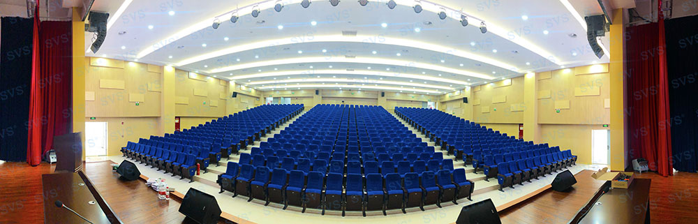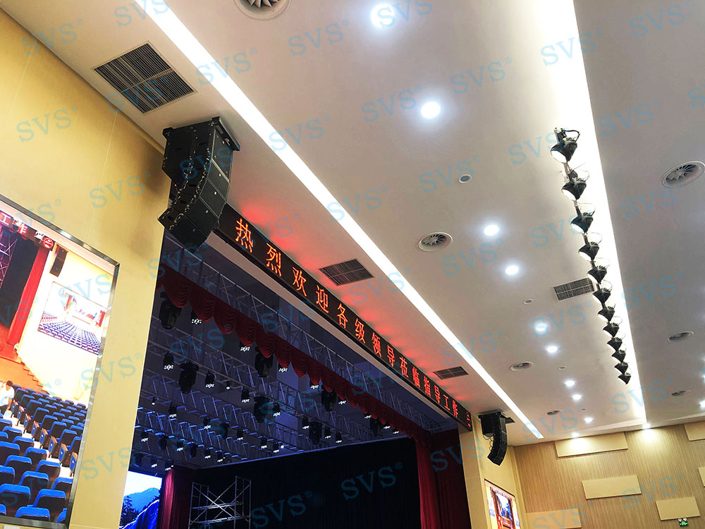 ,此次迅控为某中学打造大型阶梯多功能厅,会场可容纳近800人进行会议。因为会场场地较大,且客户希望打造出高品质的声场效果,迅控为客户专门推荐了L系列线阵音箱,线阵音箱在主轴垂直平面指向性呈窄波束,能量叠加可以远距离辐射。弯曲的线性音箱组装可以让下端覆盖近区,中上端覆盖中区及远区,形成自近而远的等声压覆盖。线阵音箱采用专用数字处理器精准分频后由高阻尼的功率放大器推动各频段内部单元,让不同频段的声音,只在不同的单元特性范围里响应,各司其职,达到完美吻合度,解决了传统的音箱墙导致的声音干涉,浑浊,声压远近不均匀的难题。并配置全新数字调音台D2018,多种效果预设,让声音处理达到专业表演级标准,现场效果得到客户一致好评。