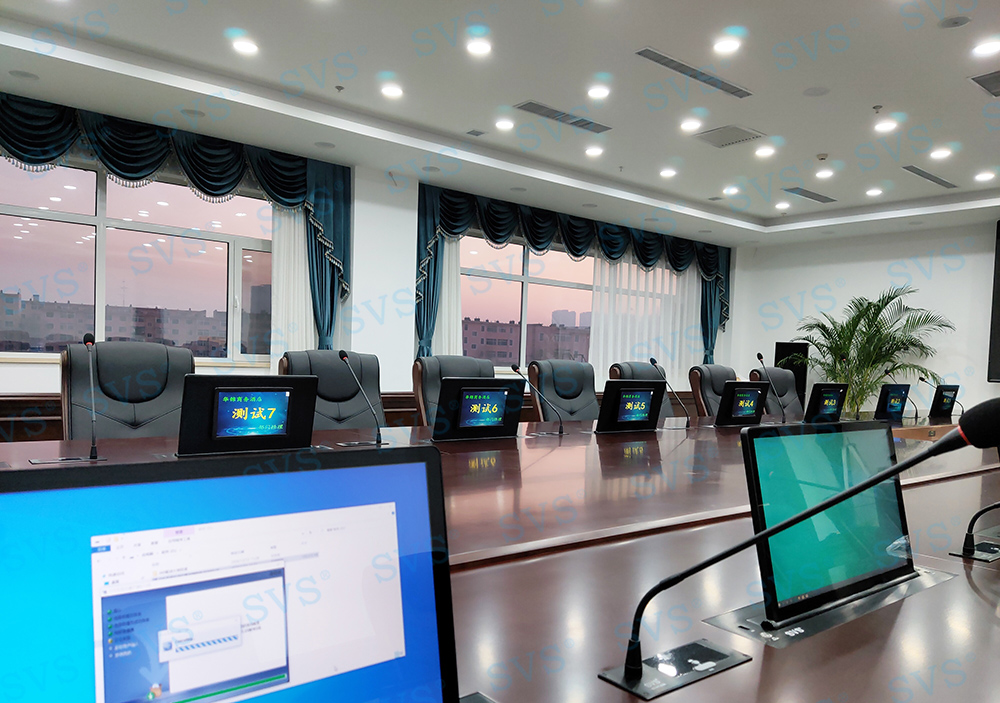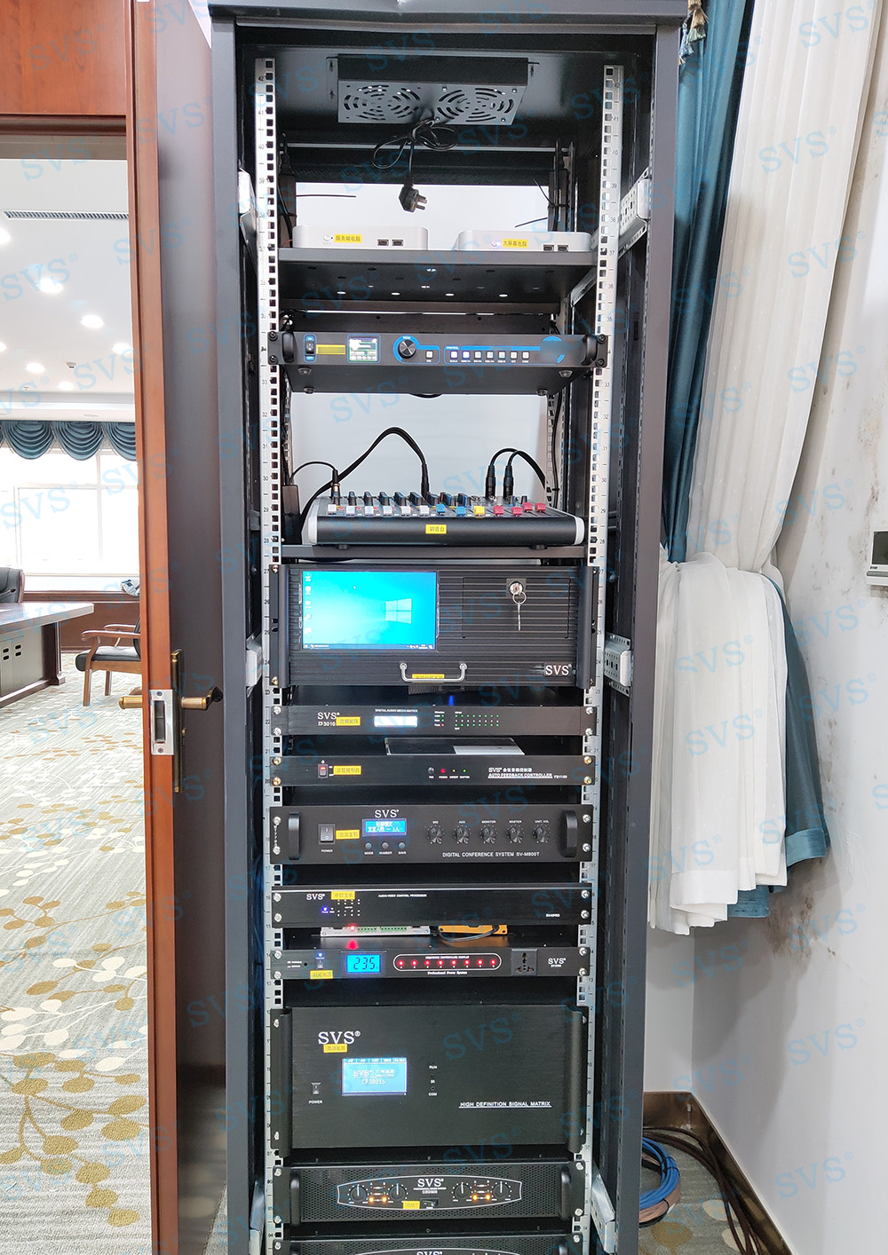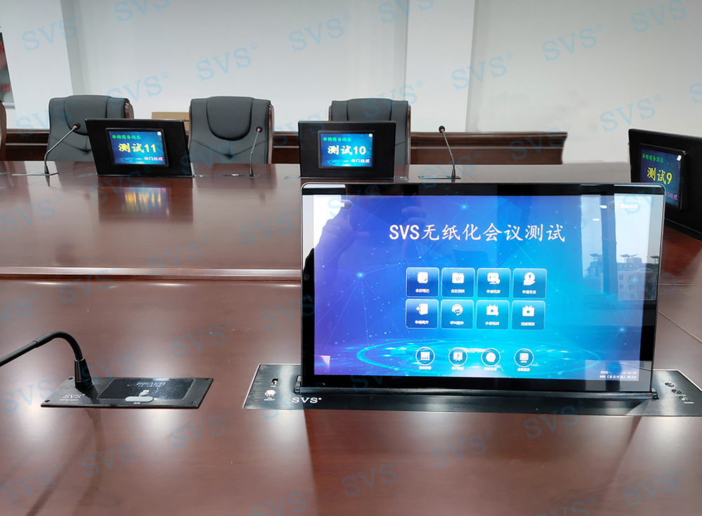 ,此次SVS为某商务酒店打造无纸化会议室,为客户推荐使用双屏升降器SV-LCD17TD,配合专业无纸化服务器SV-MP200B,此款服务器核心程序采用无人值守模式,开机后台自动运行;支持应用服务、消息服务和媒体服务监控功能;支持系统管理功能、人员管理功能、建立会议界面、会议资料管理功能、会议投票等功能。信号处理系统选用混合型处理主机D3001(S),此款主机包含音视频信号和控制信号处理功能,支持HDMI,VGA、DVI和SDI等视频信号,中控部分支持串口、红外、弱继电器和IO等接口。可以满足各种类型应用场合(例如:报告厅、多功能厅、无纸化会议室、视频会议室、指挥中心、数字展厅等)视音频信号高速切换和中控控制的要求。中控系统、会议系统、扩声系统、发言系统的相互结合,轻松提高会议效率,打造出一个具有先进性和实用性的数字无纸化会议室。