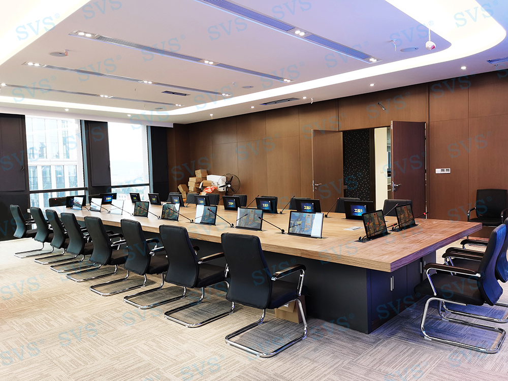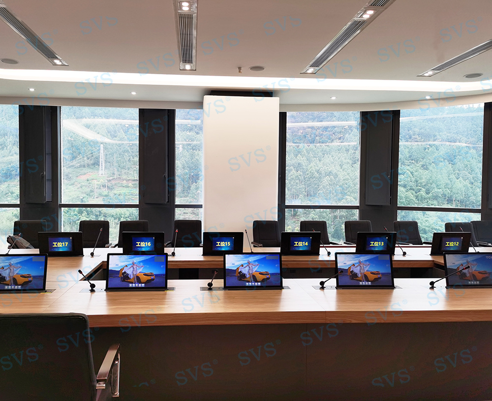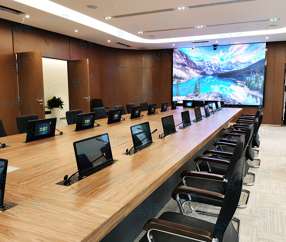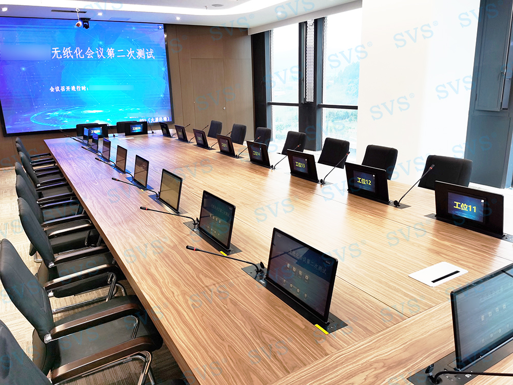 ,此次SVS为某集团打造无纸化会议室,会场共设20个席位,为每个席位配置了带话筒液晶屏升降器SV-LCD17(A1/B1),搭配无纸化软件的使用,轻松实现普通会议、无纸化会议、多媒体会议等多种会议模式的切换。再配合专业无纸化服务器SV-MP200B,此款服务器核心程序采用无人值守模式,开机后台自动运行;支持应用服务、消息服务和媒体服务监控功能;支持系统管理功能、人员管理功能、建立会议界面、会议资料管理功能、会议投票等功能。整体效果获得现场一致好评。