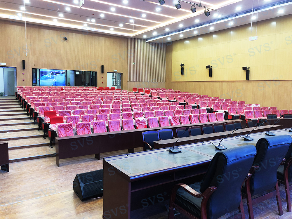 ,此次SVS为某大学打造大型阶梯多功能厅,会场可作多种用途使用,可容纳约320人进行会议。因客户希望打造出高品质的会议效果,迅控为客户配置了台面可移动式时钟会议系统发言单元以及专业扩声系统。其中L系列线阵音箱在主轴垂直平面指向性呈窄波束,能量叠加可以远距离辐射。弯曲的线性音箱组装可以让下端覆盖近区,中上端覆盖中区及远区,形成自近而远的等声压覆盖。解决了传统的音箱墙导致的声音干涉,浑浊,声压远近不均匀的难题。搭配数字调音台D2018,采用七寸OLED双向可触摸操作屏,即时可见,强大的输入输出接口,满足各类场景的使用;时尚科技感外观、人体工程学设计,满足最佳操作视角;多功能切换LED指示灯条,软、硬件联动电动推子等,具备高端调音台的一切配置。会场通过会议系统、扩声系统、信号处理系统的相互结合,轻松提高会议效率,打造出一个具有先进性和实用性的多功能厅。