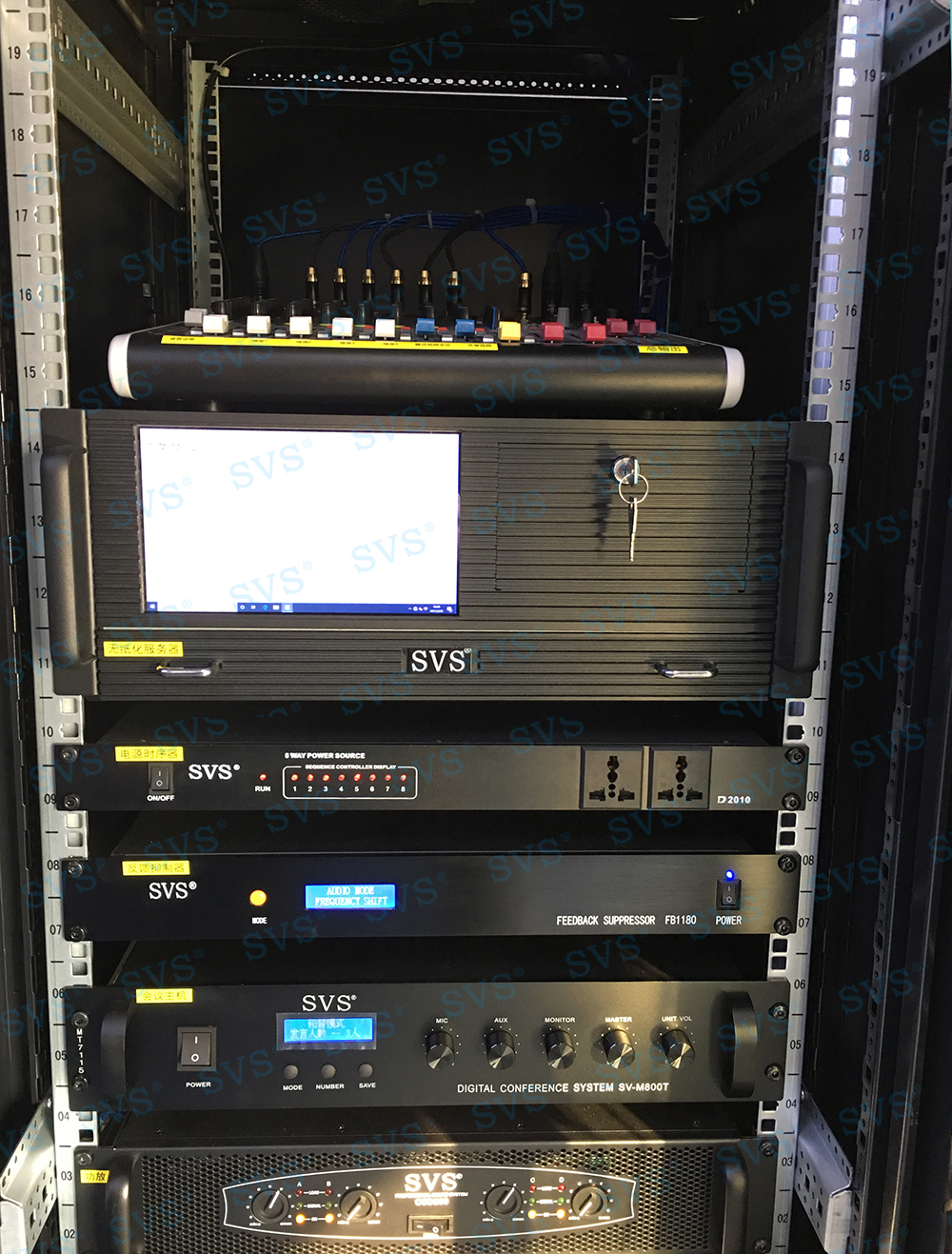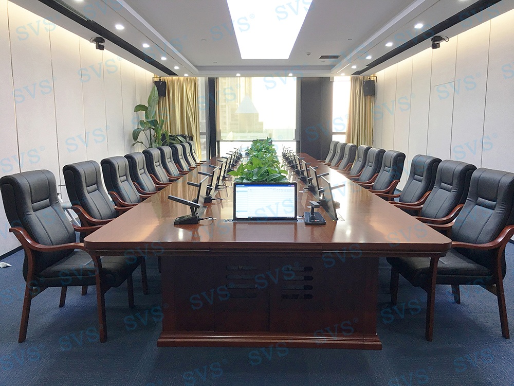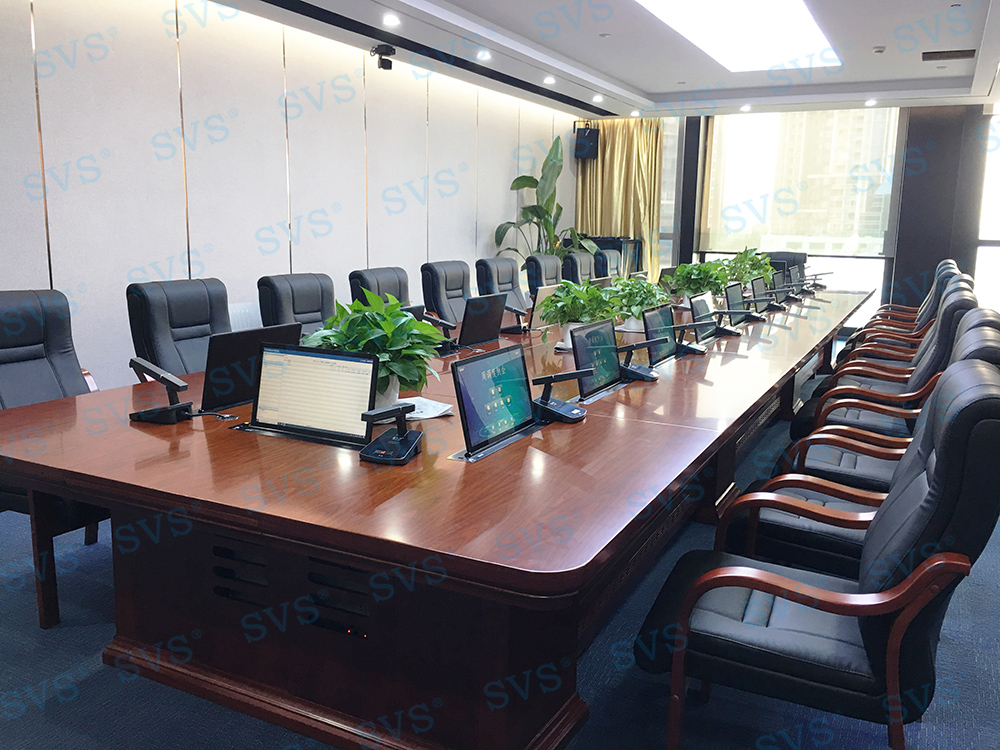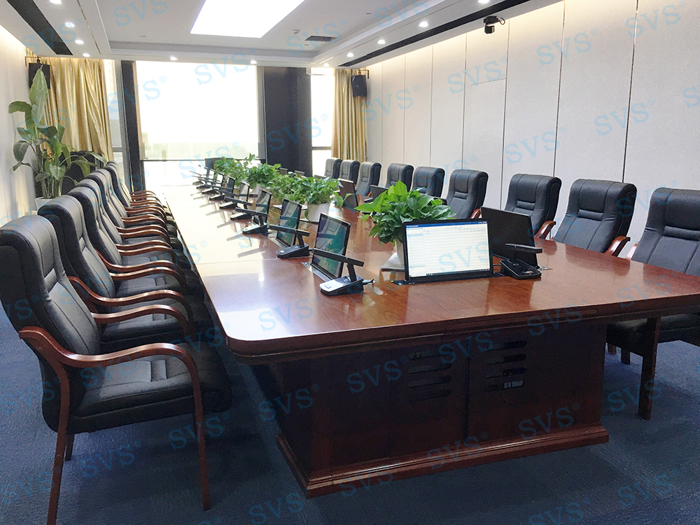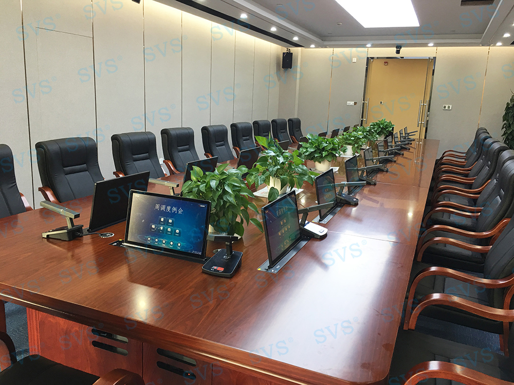 ,此次SVS为某企业打造无纸化会议室,为客户推荐使用液晶屏升降器SV-LCD17,配合专业无纸化服务器SV-MP200B,轻松提高会议效率。发言系统选用可移动式时钟会议发言单元SV-MT338A/B,单元具有新型的OLED显示大屏,程序化显示时钟、发言计时、倒计时等内容,让会议更加高效、高质量完成;配合数字处理电路,展现高保真、高灵敏度、远距离发言效果;组建系统简单,使用方便,功能强大,效果一流,适用于高要求、固定多位置需要发言的会议场所。打造出一个具有先进性和实用性的数字无纸化会议室。