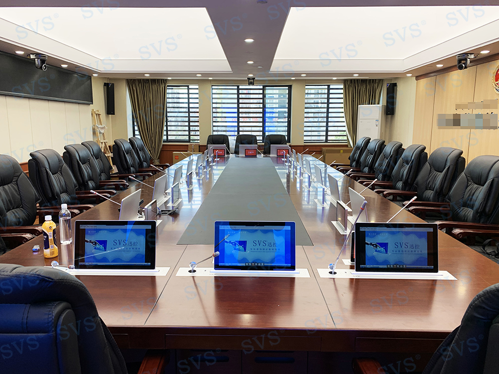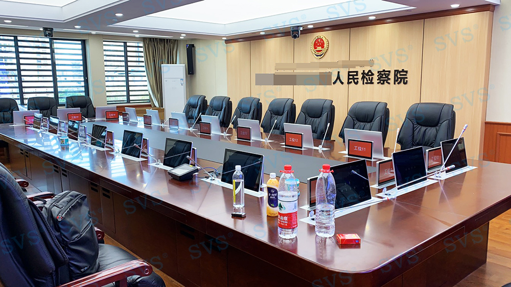 ,此次SVS为某人民检察院打造高端无纸化会议室,会场共设20个席位,为客户特别定制银色款液晶屏升降器SV-LCD17(TS)、银色款升降桌牌。升降桌牌采用电子墨水屏技术,除了出色的双面显示效果,还拥有超低能耗,可长时间使用无需充电更换电池。科技感十足,配合SVS无纸化会议系统,轻松实现普通会议、无纸化会议、多媒体会议等多种会议模式的切换,轻松提高会议效率。