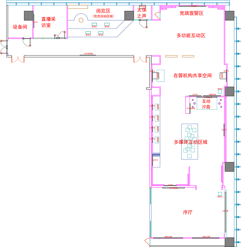 展厅机构共享区域采用4台电视与4台32寸一体机,搭配控制系统与扩声系统,结合一体机触点智能交互控制,以多媒体内容呈现太保党建成果的经验精华,促进机构间党建交流,展现太保党建新形象。