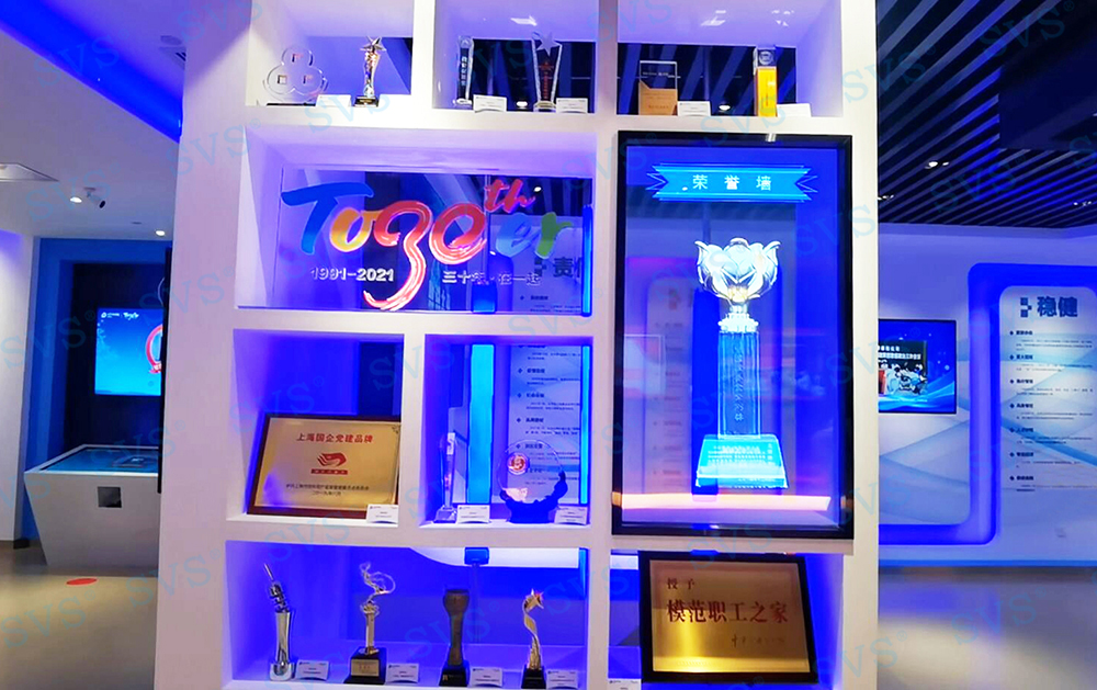 展厅透明屏展柜(虚拟展品扩展)区域采用了LED透明屏作为创意显示,晶莹剔透,轻薄简约,智能控制,感受科技与美的交融,沉浸式视觉盛宴,搭配扩声系统让您身临其境。