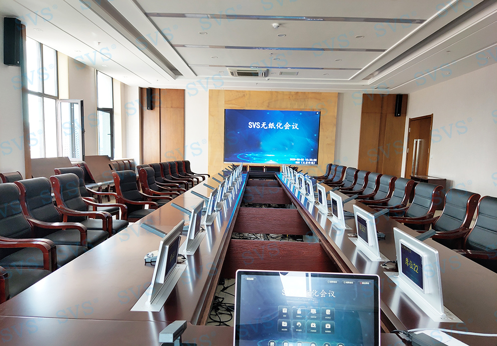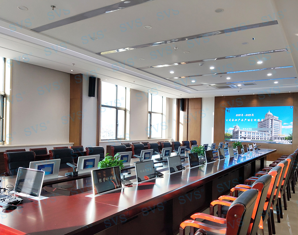 ,此次SVS为某军工企业打造无纸化会议室,会场可作多种用途使用,中控系统、会议系统、扩声系统、发言系统的相互结合,轻松提高会议效率,各个系统的互联互通,最终效果获得现场一致好评。