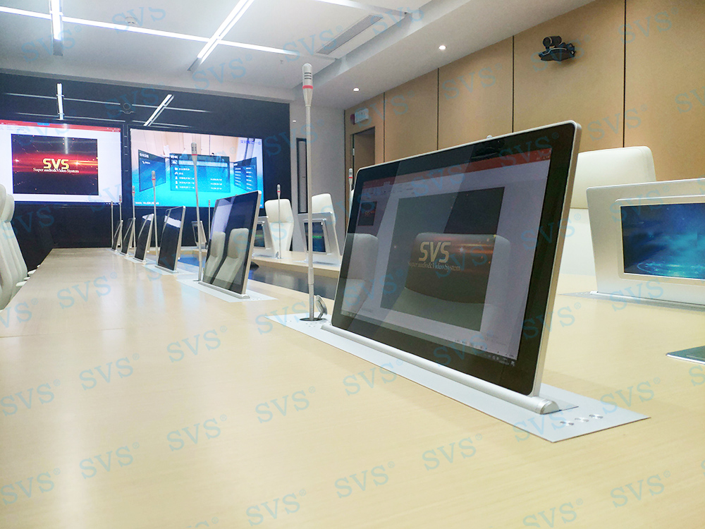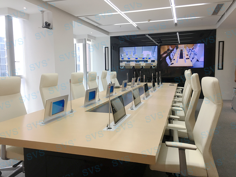 此次SVS为某集团打造无纸化会议室,会场共设置12个席位,为每个席位都配置了银色定制版带话筒液晶屏升降器SV-LCD17(A1/B1),科技感十足,提高办公效率,配合无纸化软件的使用,轻松实现普通会议、无纸化会议、多媒体会议等多种会议模式的切换。