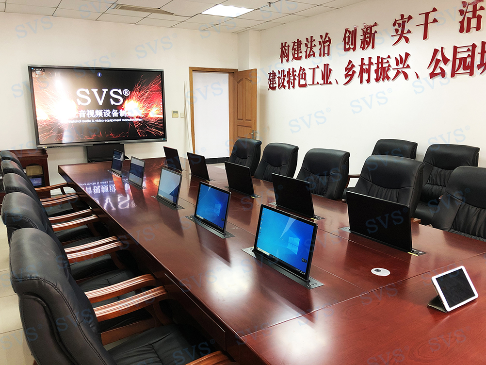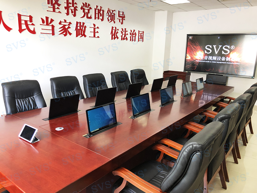 此次SVS为某市人大打造无纸化会议室,会场使用隐藏式桌面升降器,配合无纸化会议系统,硬件和软件相互结合,既保留了原有会议的简洁,也扩展了时下高效科学的无纸化会议模式,让会议更加的多元高效。