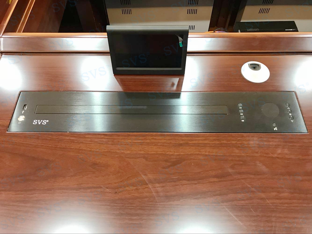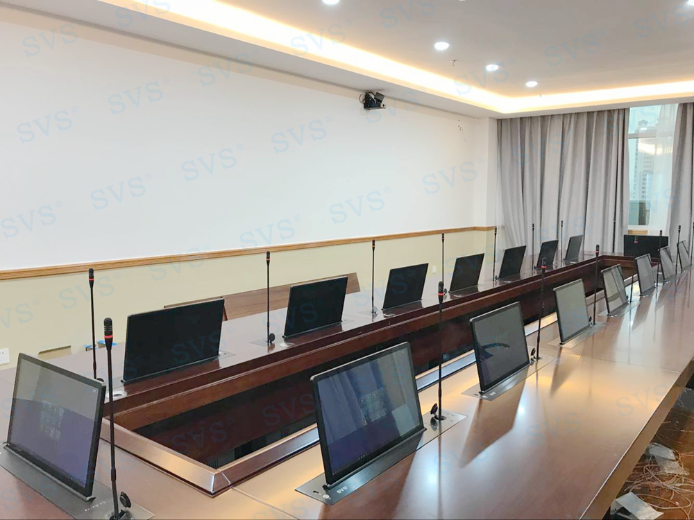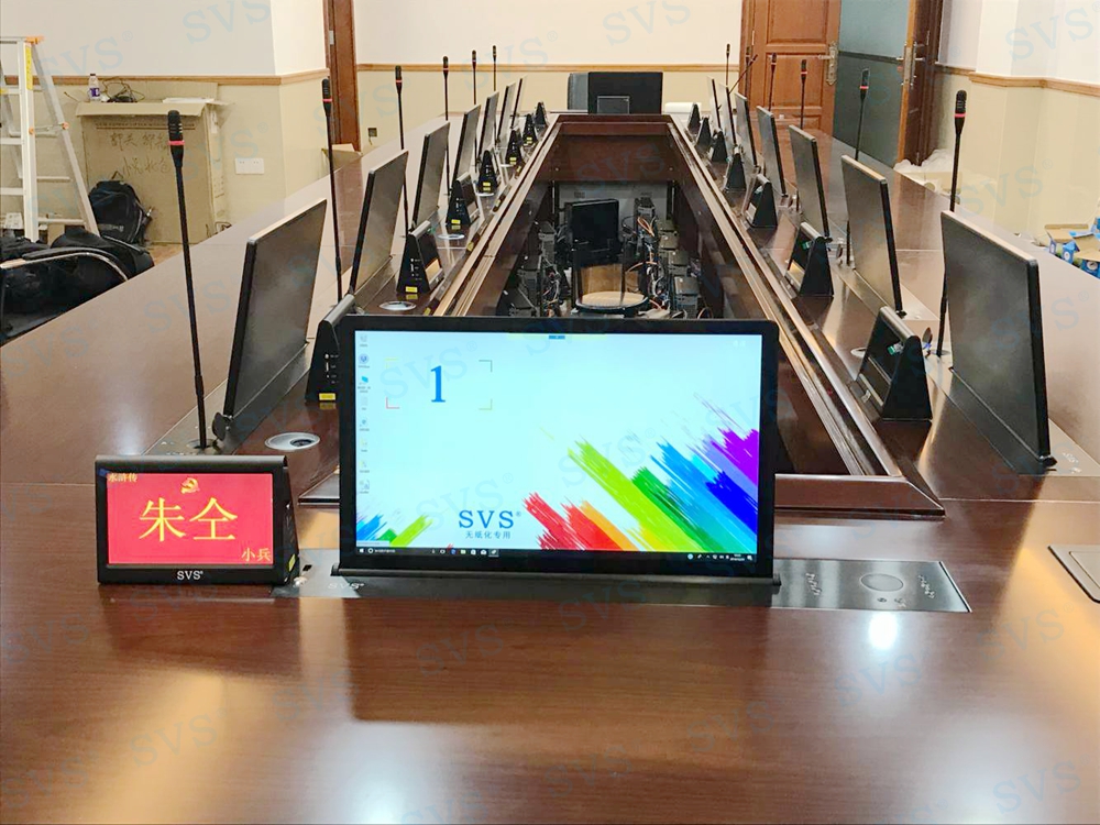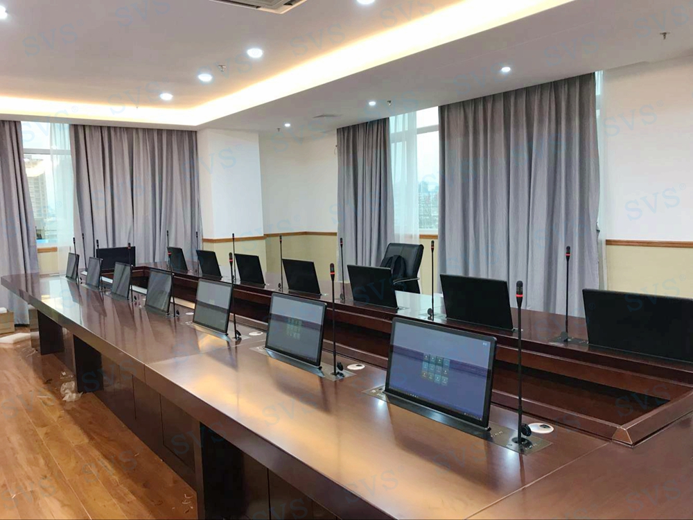 此次SVS为人民银行某分行打造一个无纸化会议室,使用带话筒升降的液晶屏升降一体机,发言系统和显示系统轻松解决,再配合上SVS无纸化会议系统,轻松打造绿色环保、高效便捷的现代化无纸化会议空间。
