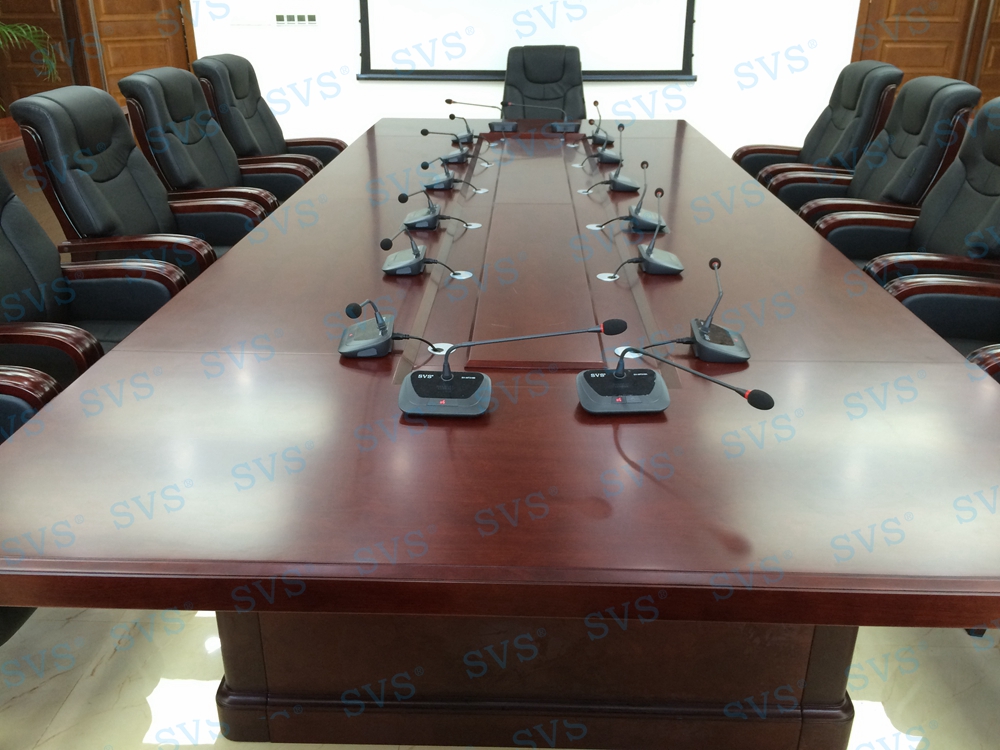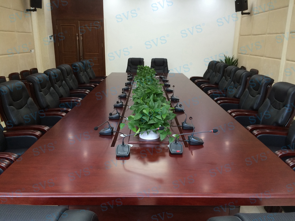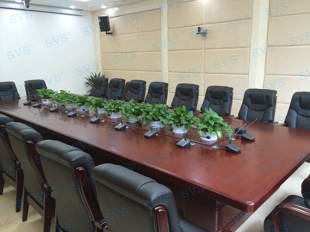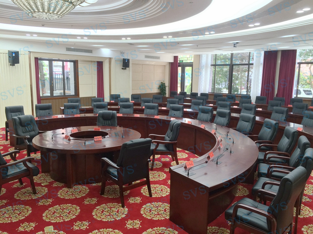 三、中型会议室:会场可容纳40人进行会议,为主席台设置了时钟发言会议系统,会场设置2组主扩声,并配置会议跟踪系统。