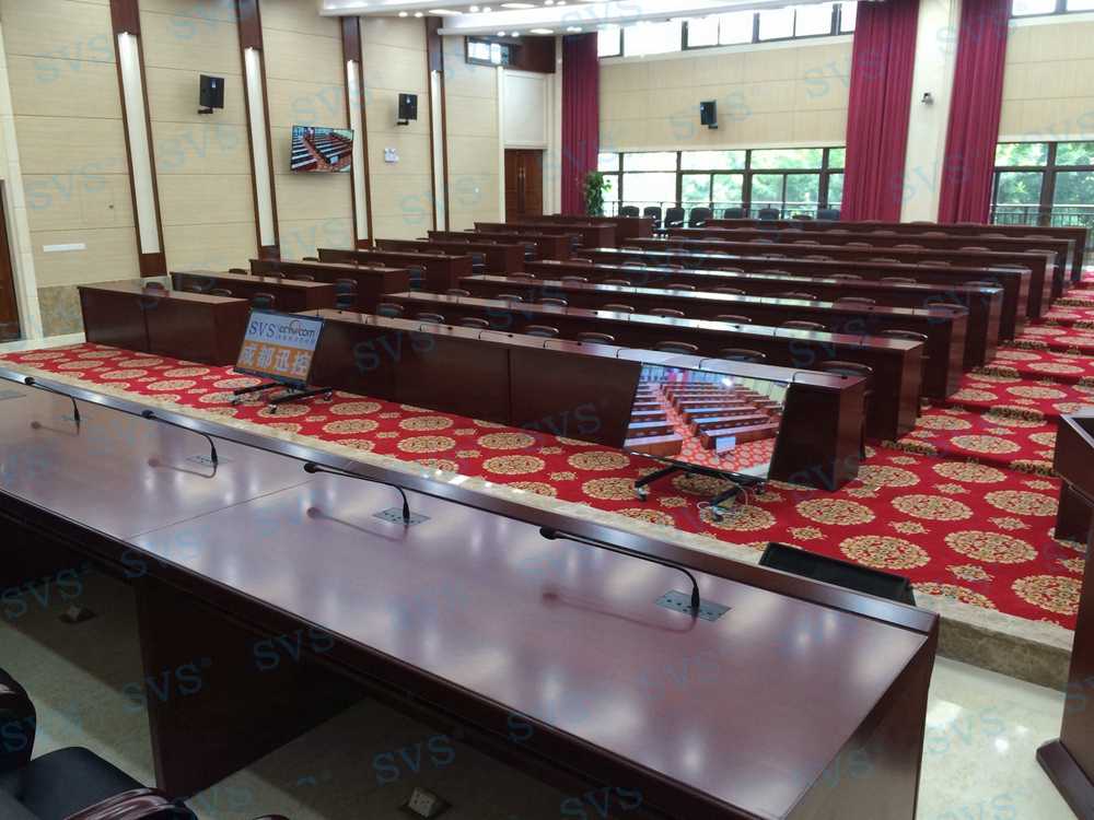 二、高级无纸化会议中心:会场可容纳60人进行无纸化会议,为60个席位均设置了桌面液晶升降器、嵌入式发言单元,会场设置1组主扩声,2组辅助扩声,配合无纸化会议系统,轻松实现无纸化会议现场。