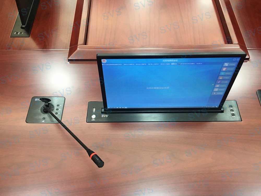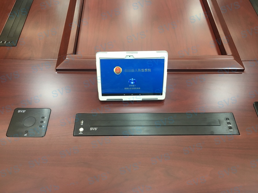 ,此次迅控为某检察院打造一个无纸化会议中心,为了打造一个干净整洁的会议桌面,迅控为客户选择了超薄无纸化升级器、话筒升降器、桌面信息盒,三种桌面会议产品结合,为客户打造出一个整洁、灵活的无纸化会议中心。
