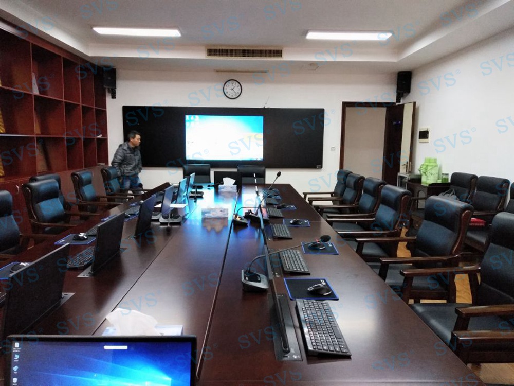 ,此次SVS为某中医学院打造一个无纸化会议中心,会场共设有15个席位,为每一个席位安装了超薄液晶屏升降器 SV-LCD17(点击了解更多):该产品为超薄液晶屏升降器,采用结构与屏体一体式设计,整机大部分采用铝合金材料,结合一次性模具成型的金属外壳,美观精致。产品动力采用直角叠加式齿轮与齿条啮合传递,直线轴承导向,完成垂直爬树式精准运动,外加自动开合门连杆结构,简单可靠,精度高,使开合动作完成后的运动面与固定台面始终保持平整。产品标配内嵌式17.3英寸全高清16:9液晶显示屏。 选配触摸板,支持10点触摸,即插即用。该产品是新时代无纸化会议或者视频会议室的主流产品,配合无纸化软件,可以实现众多功能,是与会人员之间信息化交互的重要工具。