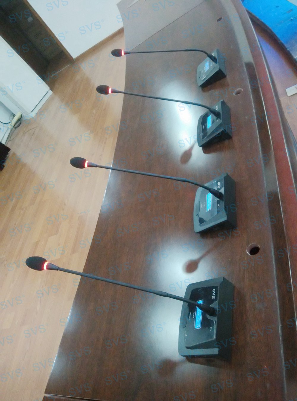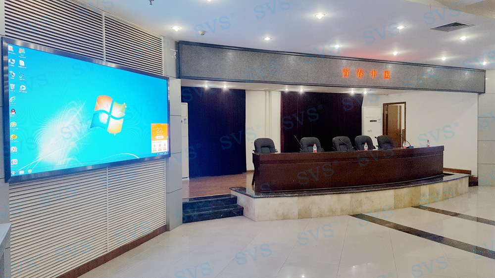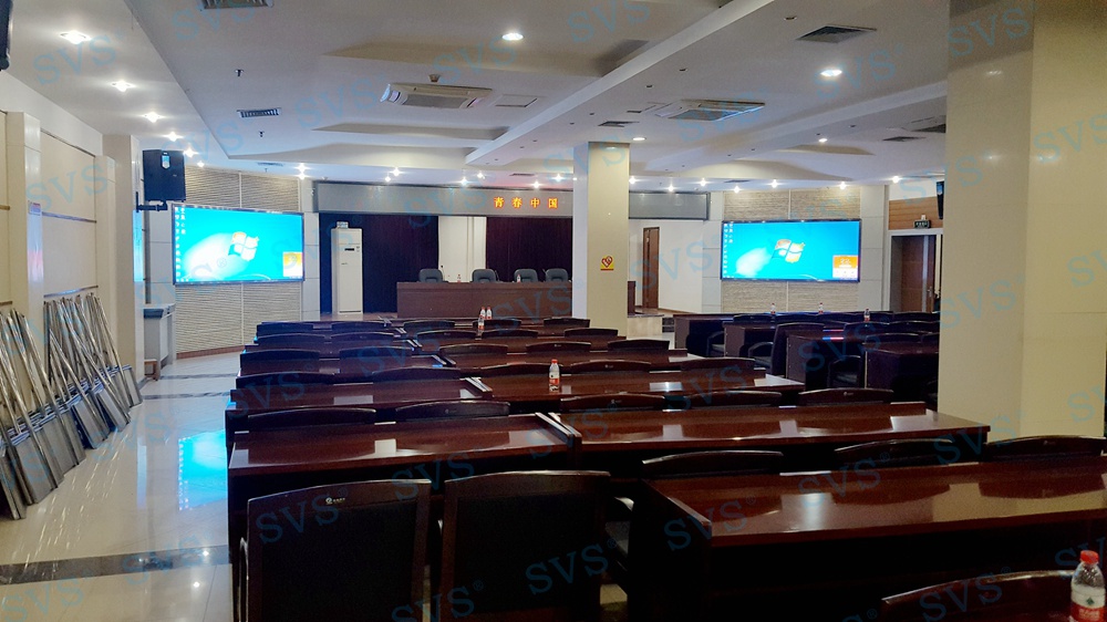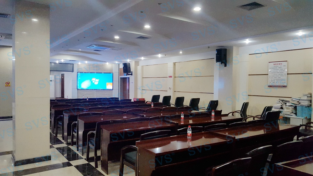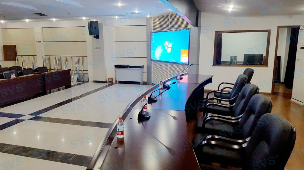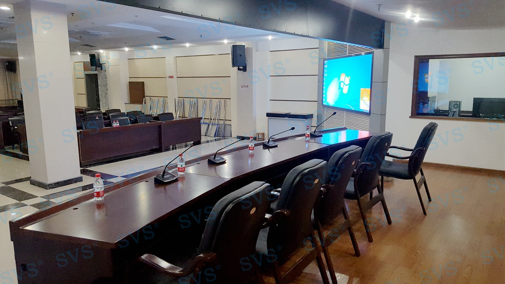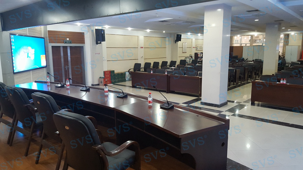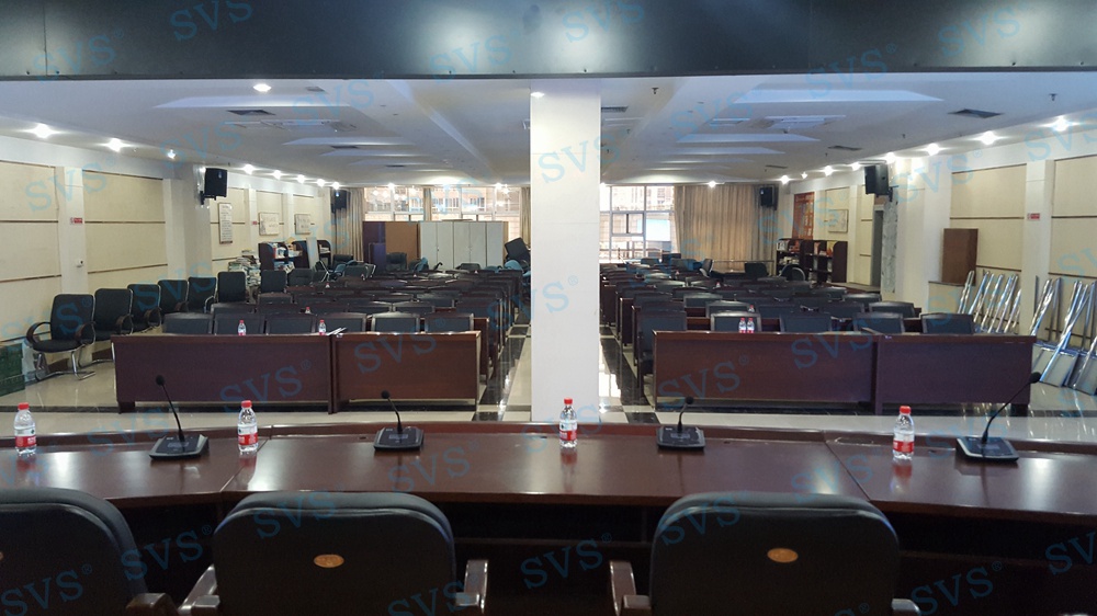 ,此次SVS为某房管委打造一个大型数字会议厅,会场可容纳近100人进行会议,设置了主席发言位,为了达到更加灵活的发言效果迅控为客户打造了无线发言系统,会场内声场环境较为复杂,多处有立柱遮掩,迅控为客户配置多组不同覆盖角度的专业会议扩声音箱系统,并与其他系统产品完美兼容,为客户打造一个高品质的数字会议厅。