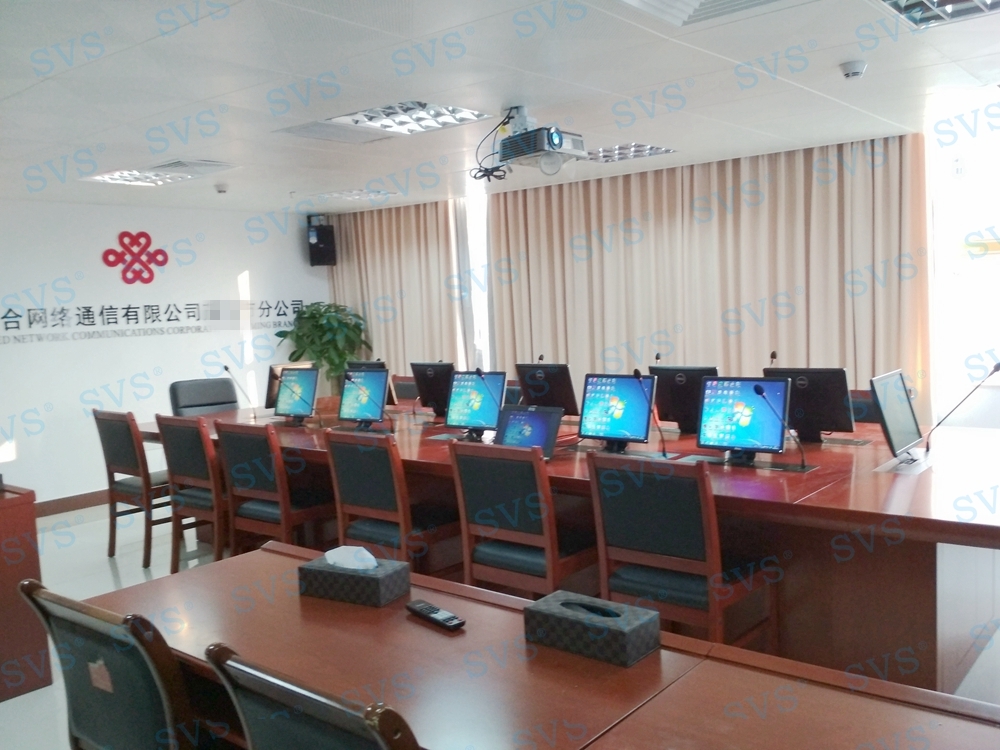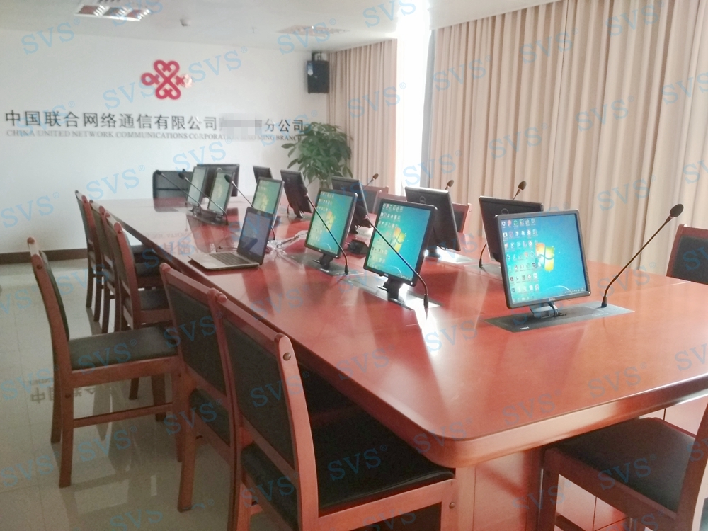 ,SVS此次为联通某市分公司打造一个无纸化会议室,会场选用 带液晶屏显示 带话筒液晶屏升降器SV-LCD17(TL)(点击了解更多详情) 该产品为超薄液晶屏与话筒升降一体机,采用结构与屏体、话筒一体式设计,整机大部分采用铝合金材料,结合一次性模具成型的金属外壳,美观精致。产品动力采用直角叠加式齿轮与齿条啮合传递和同步轮同步带传动,结合直线轴承导向,完成精准运动。产品标配内嵌式17.3英寸全高清16:9液晶显示屏, 选配触摸板,支持10点触摸,即插即用。产品还搭配高级会议系统单元,产品支持单机或者会议系统组网使用。