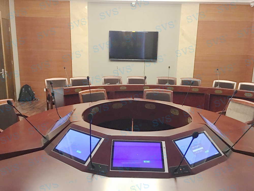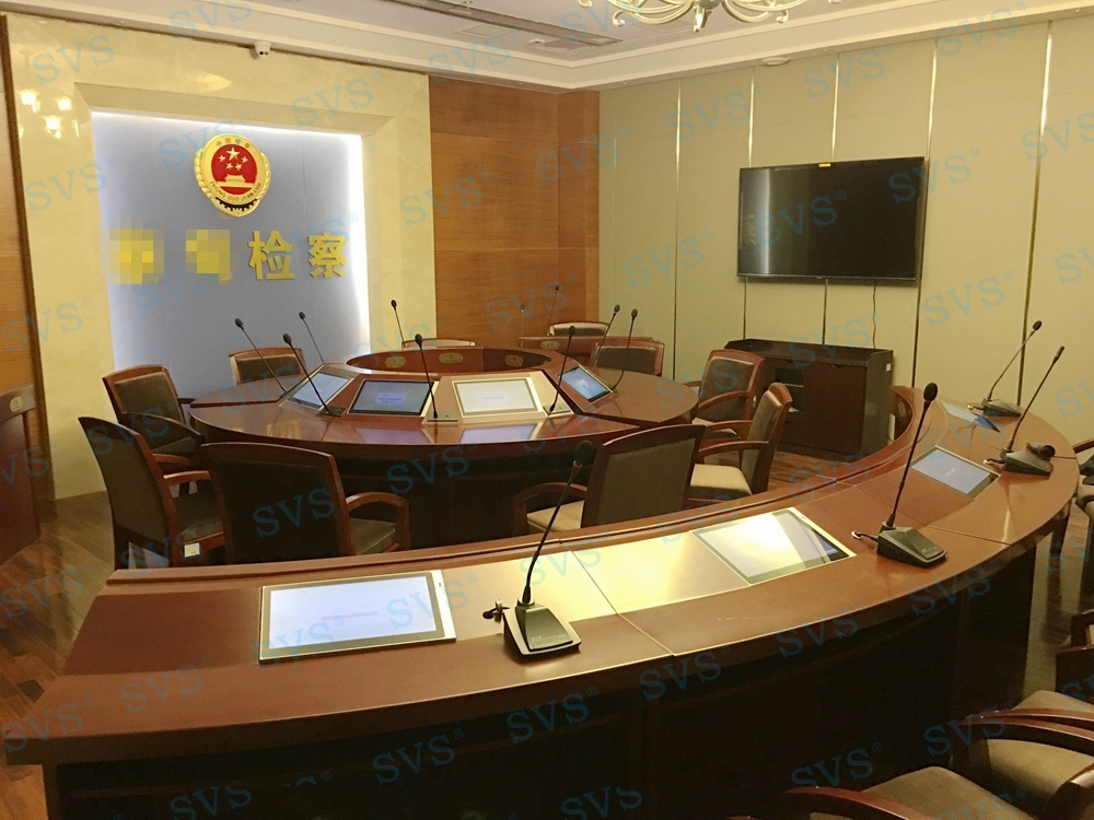 SVS为某检察院打造一个综合多媒体项目,项目包括一个无纸化会讨中心、一个圆形会议室,两个会场根据环境、使用用途不同等选择和配置了不同的会议设备,打造出来最佳适用产品及效果。