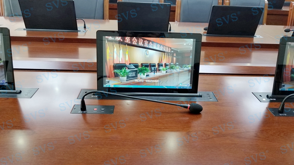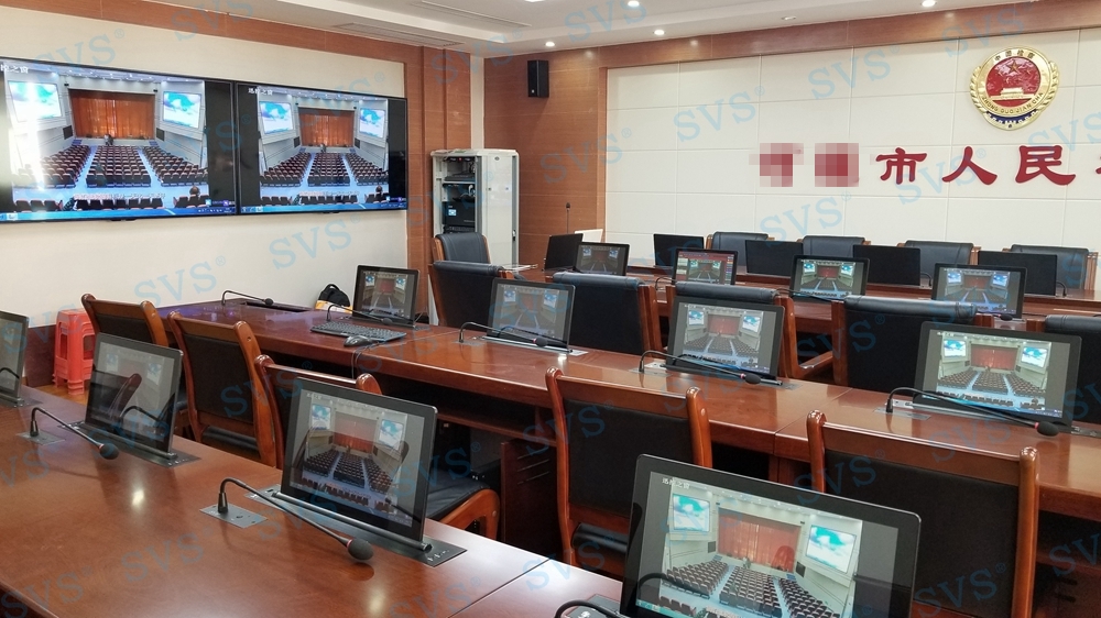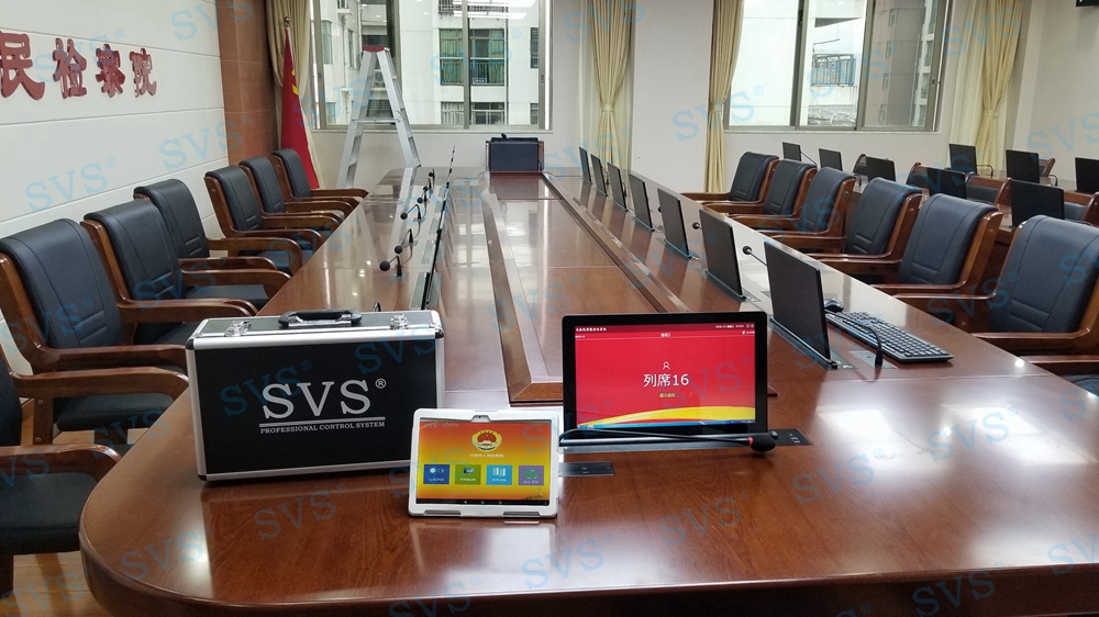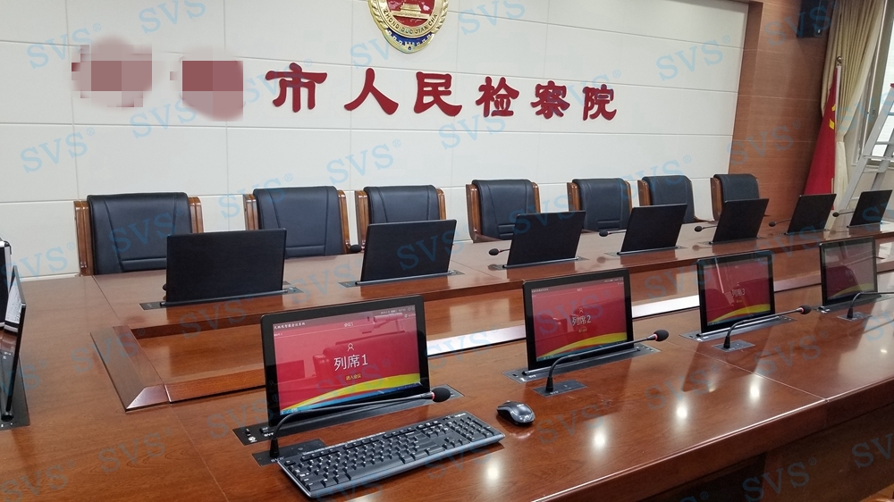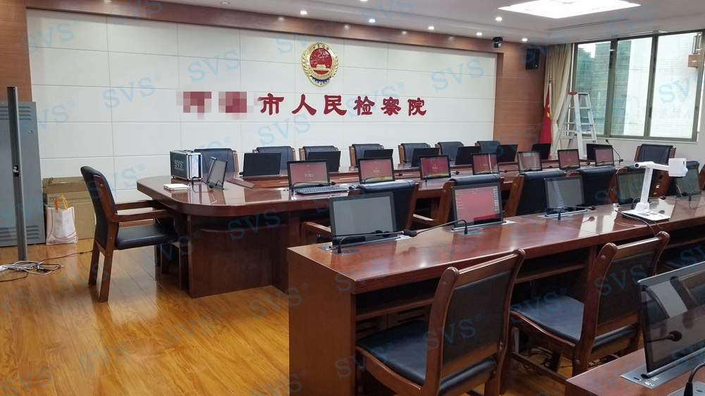 ,SVS此次为某市检察院打造全新无纸化会议厅,会场可以容纳32人进行会议,为每个席位都设置了桌面信息交互系统,并分为发布交互区和信息浏览区,两个区域根据使用用途不同,配置了不同的控制终端,发布交互区的人员可以对会议内容及时发布、更改、上传等操作,信息浏览区为会议参与者提供清晰的会议内容展示,便于记录及增加会议参与感;会场还设置了现场会议跟踪、远程视频会议等功能,为客户打造出一个集无纸化、远程视频、投票表决等综合会议模式为要一体的高级现代化会议厅,最终效果也得到了客户的高度评价。