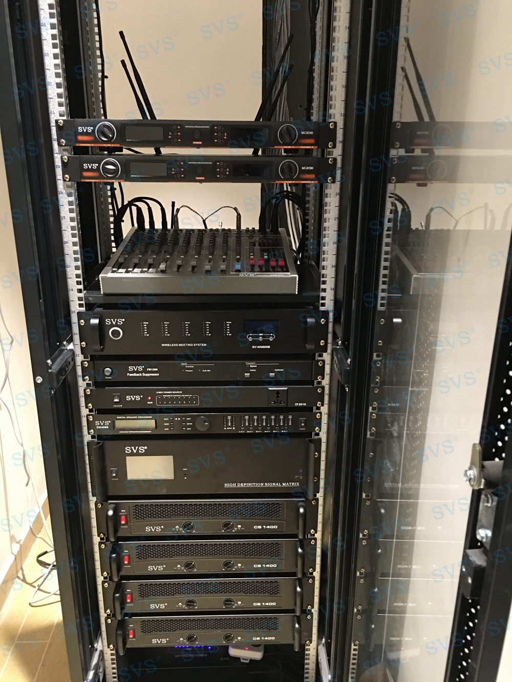 SVS为某酒店打造一个数字会议厅,会场可同时容纳近30人进行会议,会场具备多种会议模式选择,包括普通会议、视频会议、茶话会、研讨会等多种使用用途,迅控对于每个用途都有不同的使用配置,从不同发言单元、不同扩音单元等方面入手,为不同的环境打造出专属的现场效果,并通过人机交互终端,轻松实现模式切换。