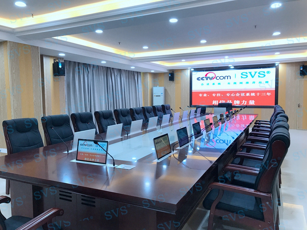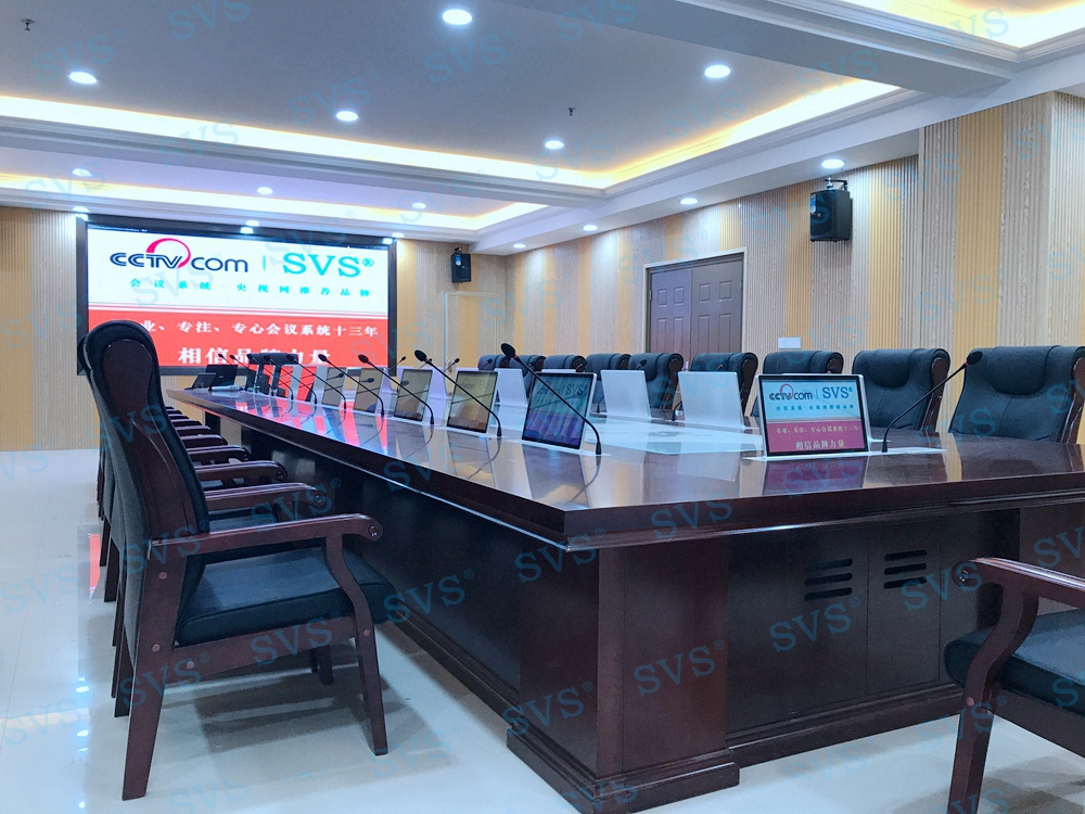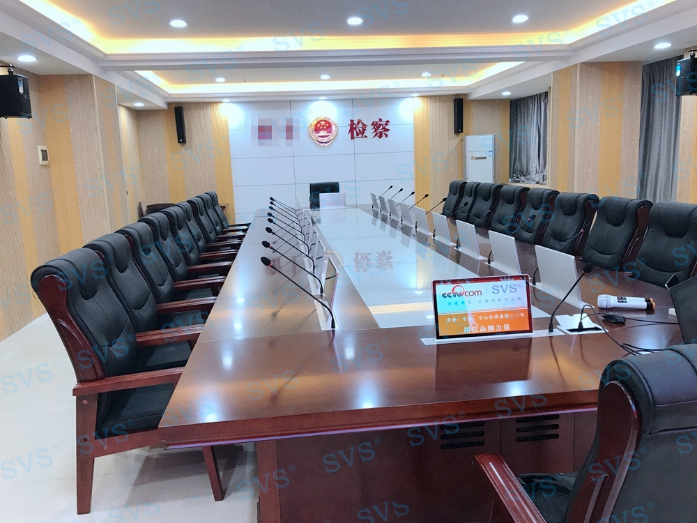 ,SVS迅控此次为某检察院打造一个无纸化会议室,作为院方的多方会客中心、办案讨论中心、学习培训中心等多种用途,会场设置了20个会谈位,每一个位置都设置了独立的显示系统、发言系统,可及时高效的查看会议资料,共享会议文件,传递会议信息等,采用阵列音箱和全频音箱的配合方式,将会场的音效提升到了新的层次,从画质、音质两方面给与会人员带来全新的高品质体验,得到院方领导的高度评价。