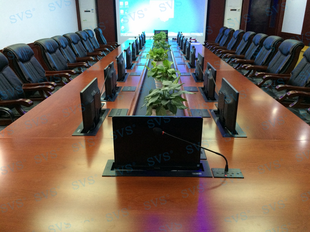 该产品为超薄液晶屏升降器,采用结构与屏体一体式设计,整机大部分采用铝合金材料,结合一次性模具成型的金属外壳,美观精致。产品动力采用直角叠加式齿轮与齿条啮合传递,直线轴承导向,完成垂直爬树式精准运动,外加自动开合门连杆结构,简单可靠,精度高,使开合动作完成后的运动面与固定台面始终保持平整。产品标配内嵌式17.3英寸全高清16:9液晶显示屏。 选配触摸板,支持10点触摸,即插即用。该产品是新时代无纸化会议或者视频会议室的主流产品,配合无纸化软件,可以实现众多功能,是与会人员之间信息化交互的重要工具。