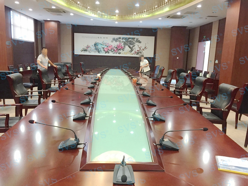 ,此次SVS数字会议系统为某政府数字会议厅服务,会场可同时容纳50人进行会议,配置22支会议发言单元为主席桌发言席使用,会场主要用于高层会议、培训会议、视频会议等。