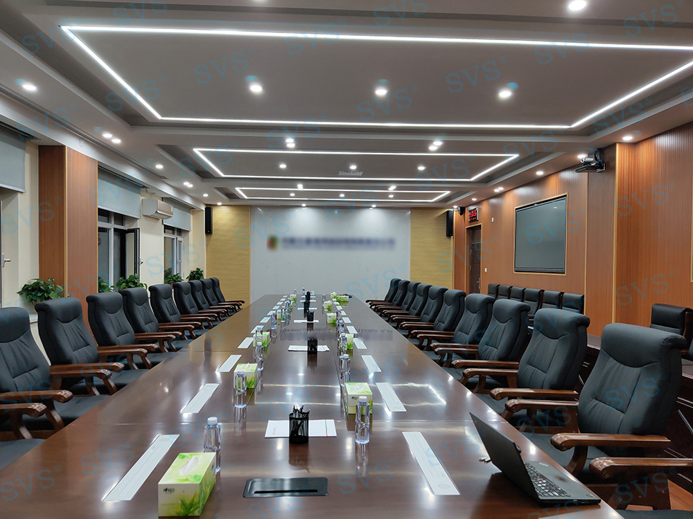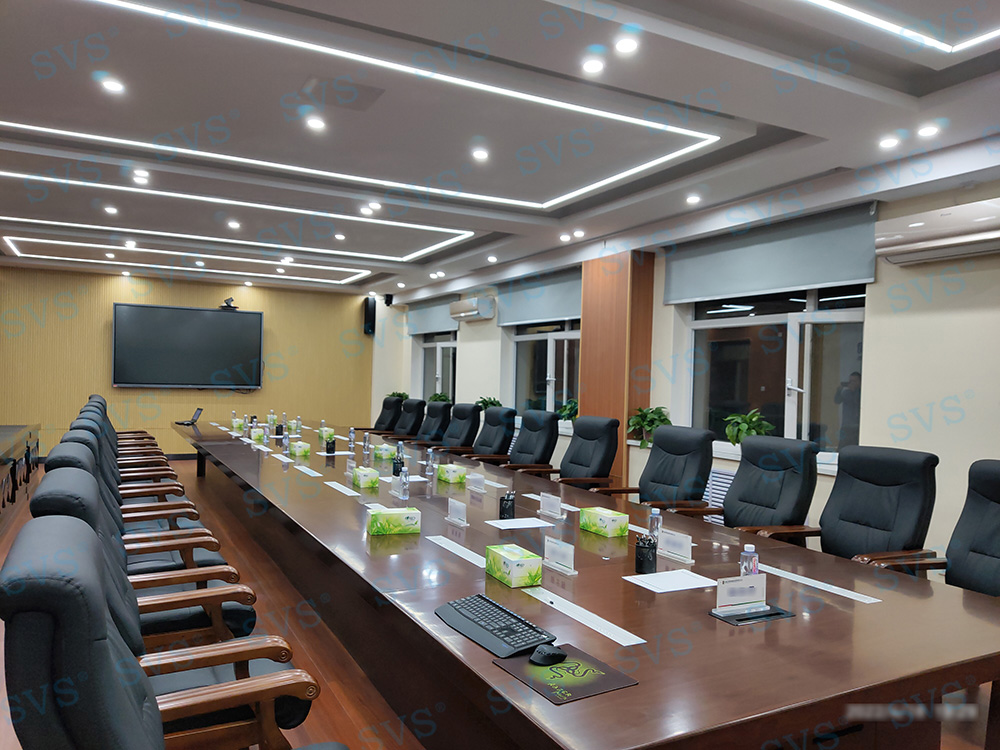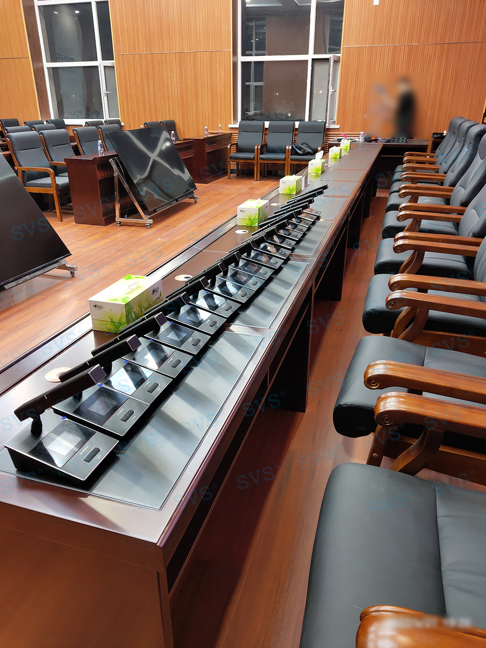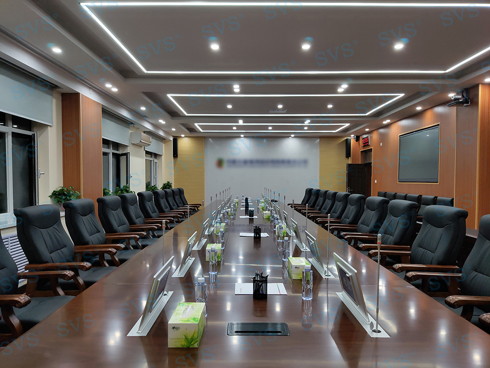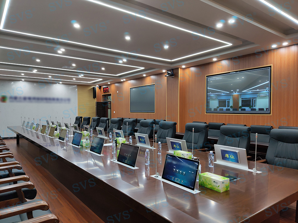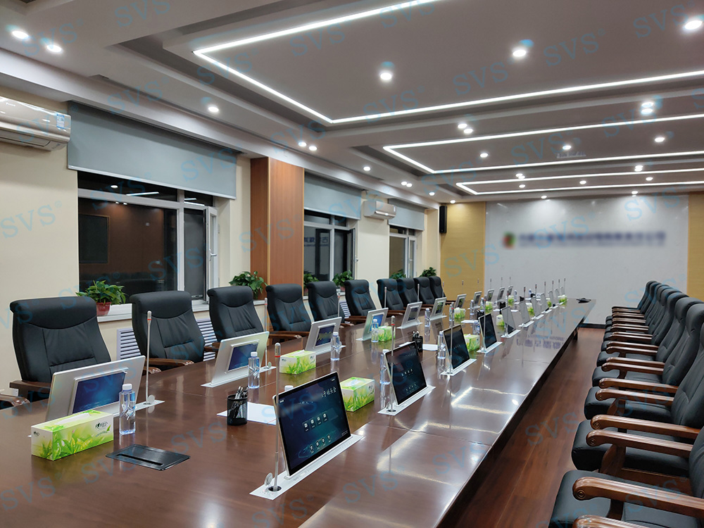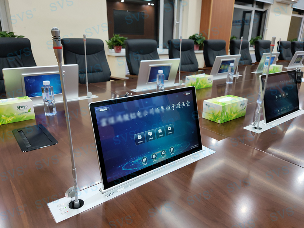 ,近日SVS为某公司打造无纸化会议室,SVS根据会场实际情况以及用户需求设计了一套智能无纸化会议室解决方案。其中亮点为迅控旗下带话筒液晶屏升降器SV-LCD17(A1/B1),该产品屏机联体,主副双面屏显示、发言麦克风结构一体化设计;显示屏和发言麦克风均可独立电动升降。另搭配无线发言单元SV-WM92A/B,采用可拔插式超短咪杆,美观精致,单元内置2.4英寸彩色显示屏,显示发言单元电量、ID、当前信道和发言时计算等信息,支持摄像跟踪功能,具有发言单键与指示灯,可自由控制发言状态。整体效果获得现场一致好评。