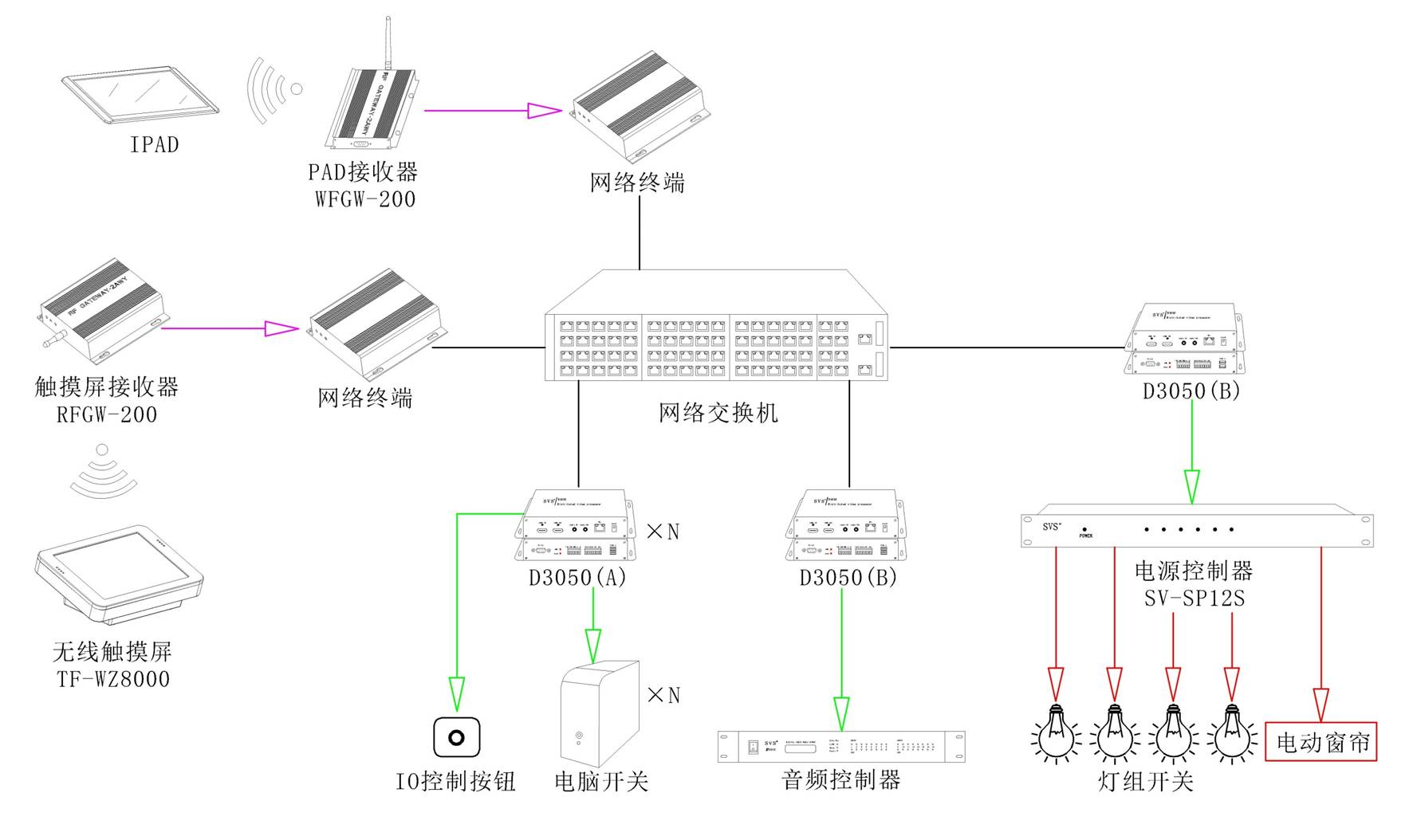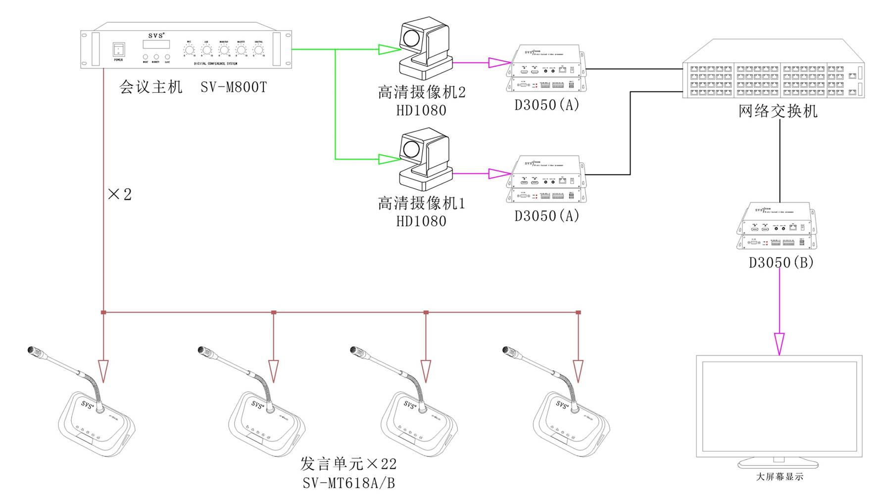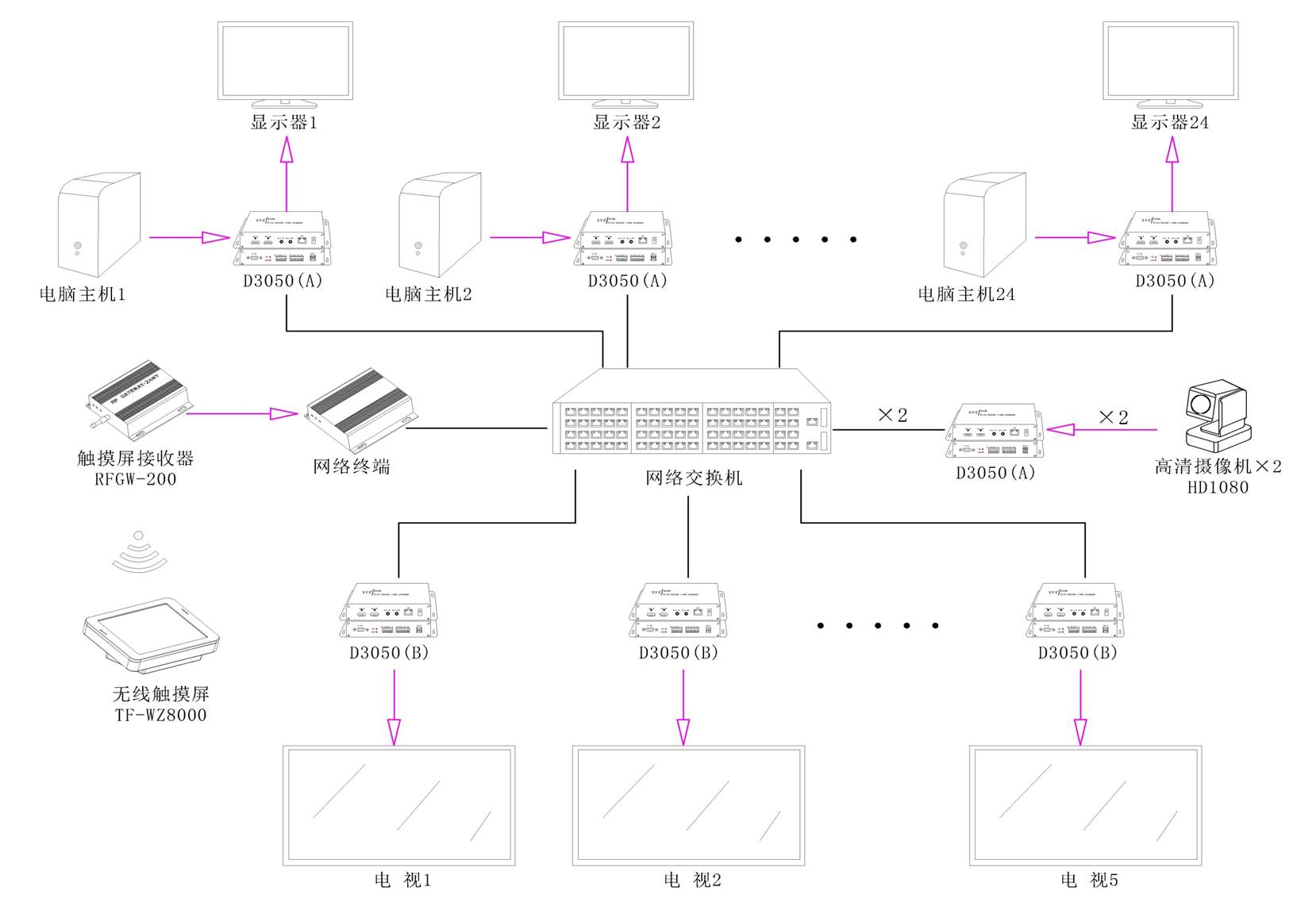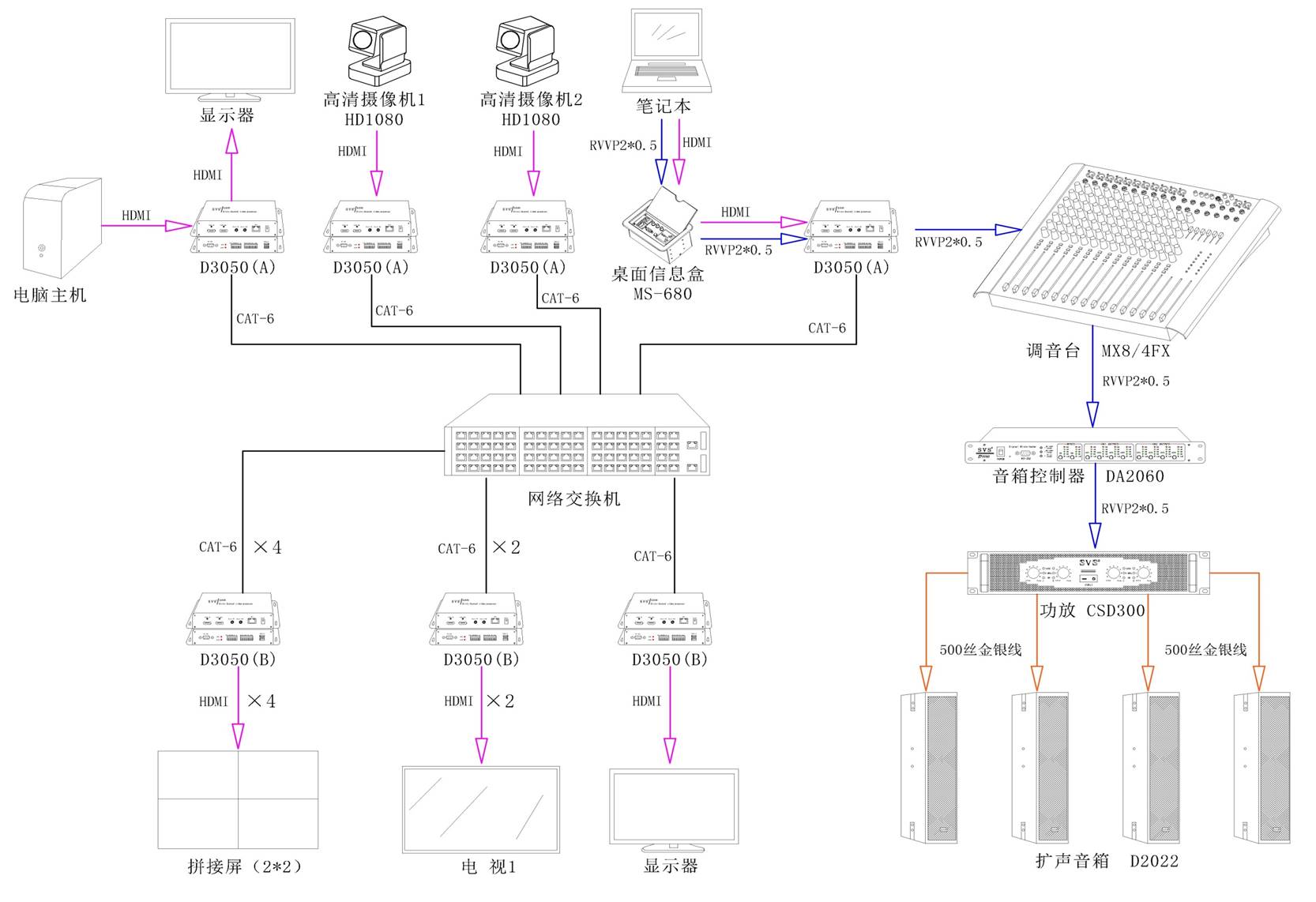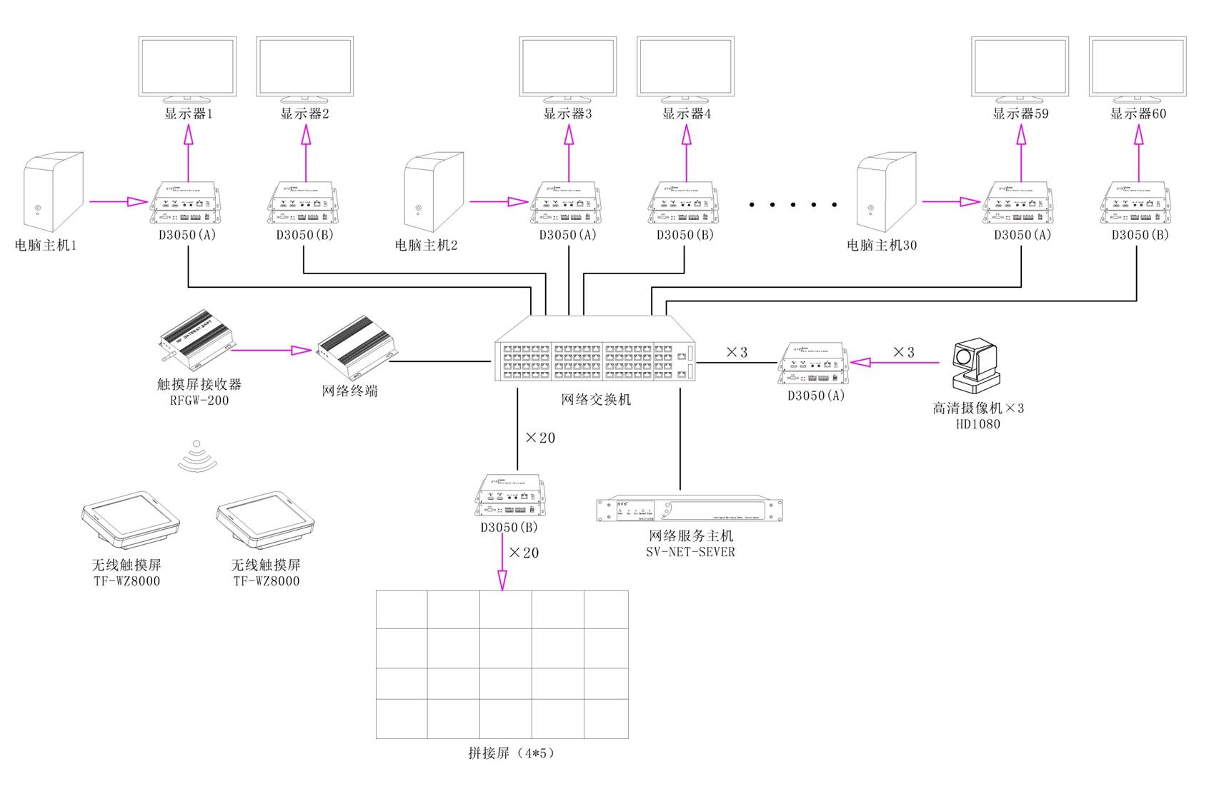 在当前高清晰视频技术和网络技术迅速崛起,并且应用的行业越来越多、环境越来越复杂的情况下,为适应现代化的智能会议室建设要求,我们为本项目设计了由SVS自主研发的分布式信号传输系统(D3050),该系统基于网络,集成了行业领先的音视频信号编解码传输及无缝切换技术、智能控制通讯技术、KVM切换传输技术、高清图像处理技术及数字网络通信技术等融为一体,可以方便地将网内各区域的音视频信号、控制信号及电脑KVM信号灵活接入系统,并且相比传统的工程布线和售后维护也更加的方便高效。