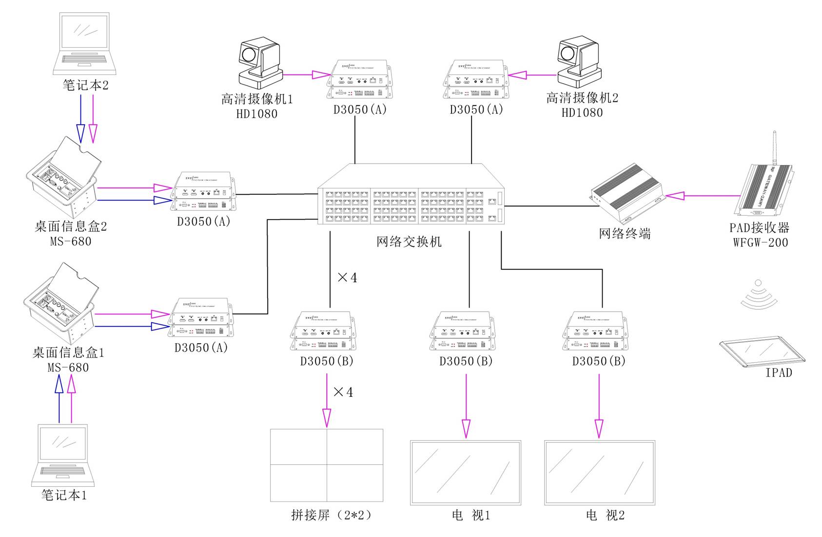 4.3、三楼会议室我们设计使用4块55英寸3.5mm超窄拼缝的高清液晶拼接屏(D5002)作会场主要显示,另外配备2台70英寸液晶电视作会场辅助显示,系统拓扑图如下: